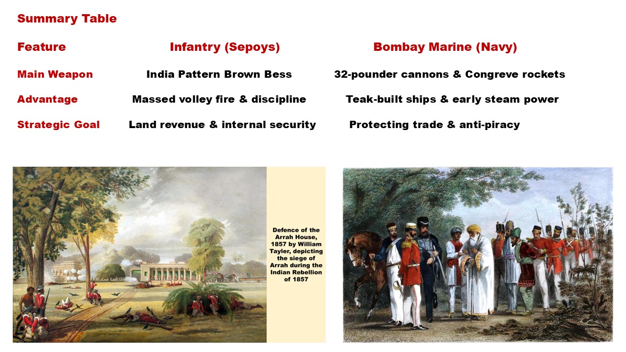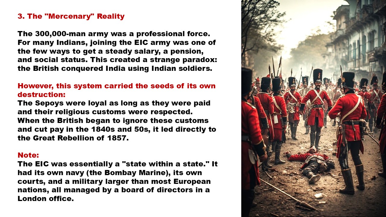 Violence: The EIC maintained order through a massive private army, which grew to 300,000 soldiers by 1820. This force was used to enforce "ruinous taxation" and carry out officially sanctioned looting.