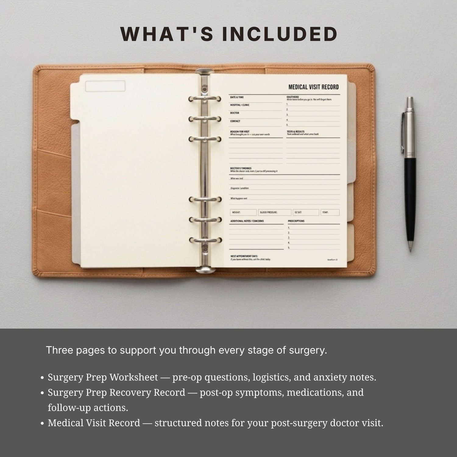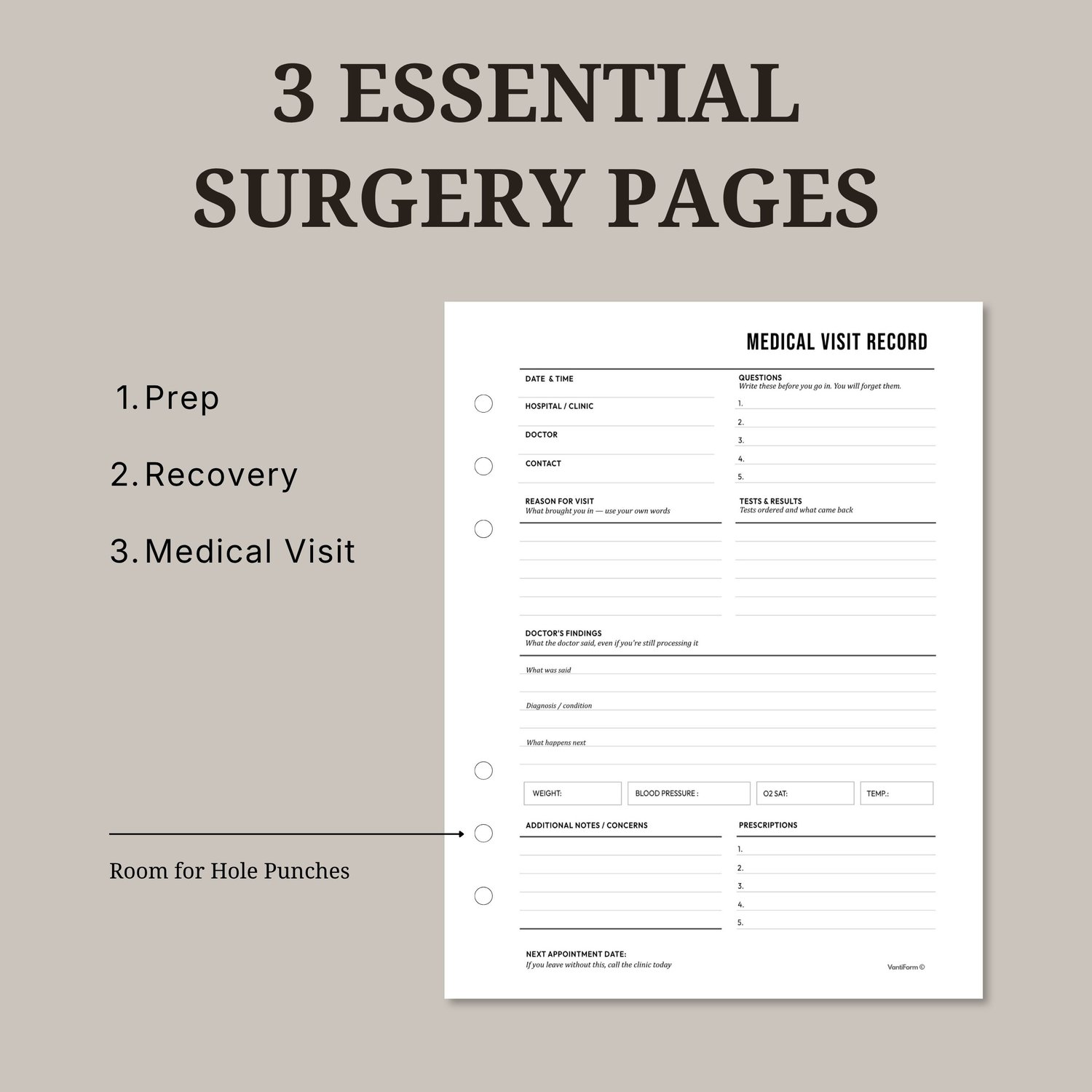 Recording surgery details, pre-op requirements, questions for your doctor, logistics, and recovery planning.