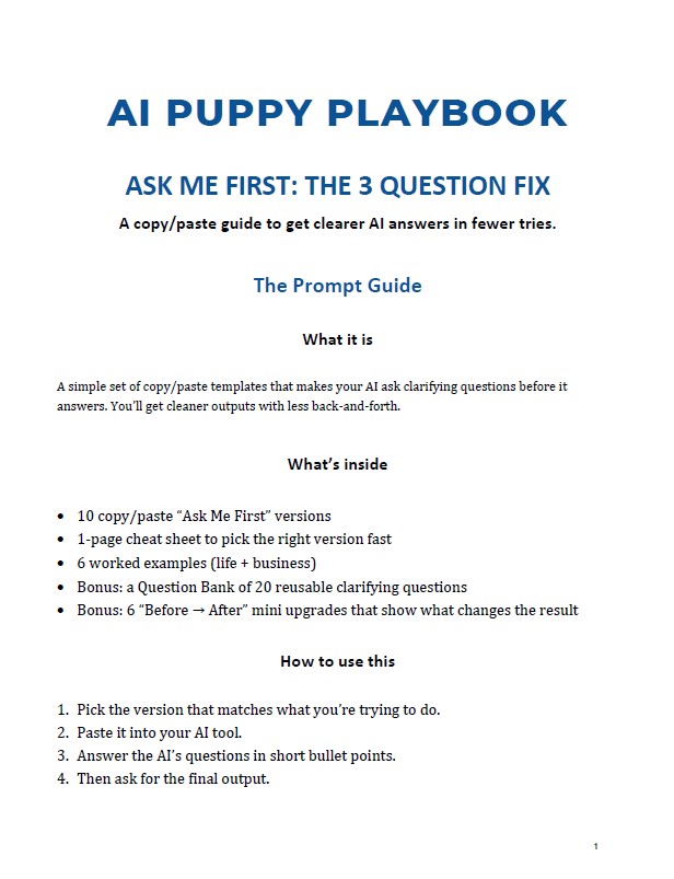 If your AI gives you vague or off-target answers, it usually needs one thing: better questions. This guide trains your AI to ask 3 clarifying questions before it answers, so you get cleaner results in fewer tries and less back-and-forth.