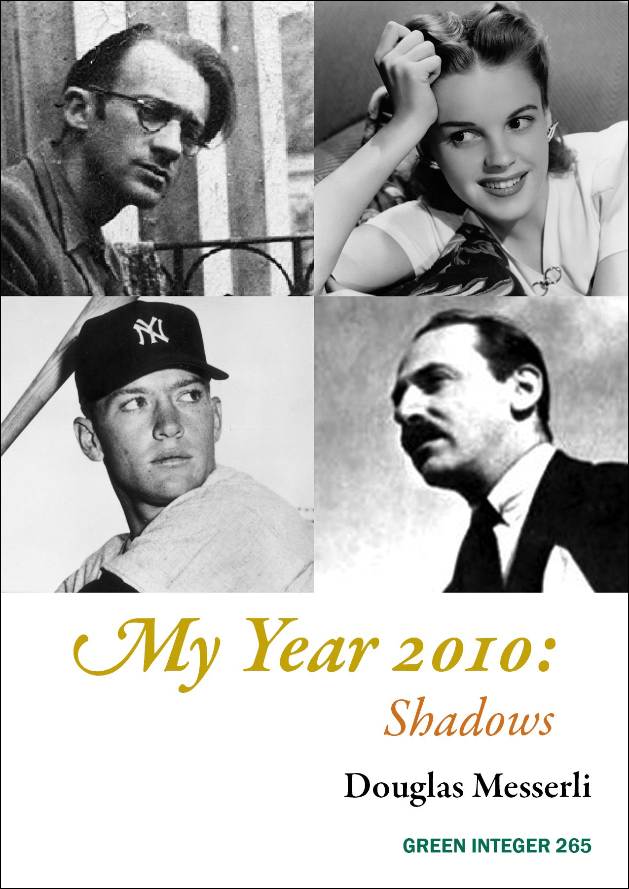 In Douglas Messerli's 11th volume of his ongoing cultural memoirs, which began with the turn of the 21st century in 2000, the author contextualizes events of the year as having fallen into the shadows. Messerli had hoped for a sunnier volume representing, perhaps, a reality more similar to the belle époque of the previous century as opposed to a year mired in political turmoil and financial difficulties that he found. Many filmmakers, dramatists, and authors, Messerli noted, turned to the past wherein they found similar dilemmas, worlds that seemed as if they should be cloaked in golden possibilities, but where, instead, its citizens lived in the shadows of fear and even terror. If there seemed to be a glow it the sky, it emanated not from the sun but from the banks of gathering fires such as those the wide-eyed young Tootie discerned on Halloween night in the turn-of-the-century-based American musical film Meet Me in St. Louis, or from the dangerous outbursts of flame threatening the citizens of Max Frisch's small town in The Firebugs. Even the gods were consumed by fire in a new Los Angeles production of The Ring Cycle, while total human extermination faced the pre-Flood folks of Karl O. Knausgaard's Biblically-inspired fiction A Time for Everything. Bombs threatened the lives of everyone in The Hurt Locker, and "vast political, psychological, and sexual dilemmas loomed over the glorious Spanish court" of Verdi's Don Carlo. The returning soldiers of Stein's Brewsie and Willie, reinterpreted in a moving new drama performed in a Los Angeles highrise, feared for their futures upon returning to the US after their experiences in Europe in World War II. Even the blessed golden-haired baseball hero, Mickey Mantle, faced his last years with the recognition of his years of neglect of both his family and his own personal health. While so much pointed in the direction of joy and pleasure, life in 2010 was revealed to be a much darker affair.