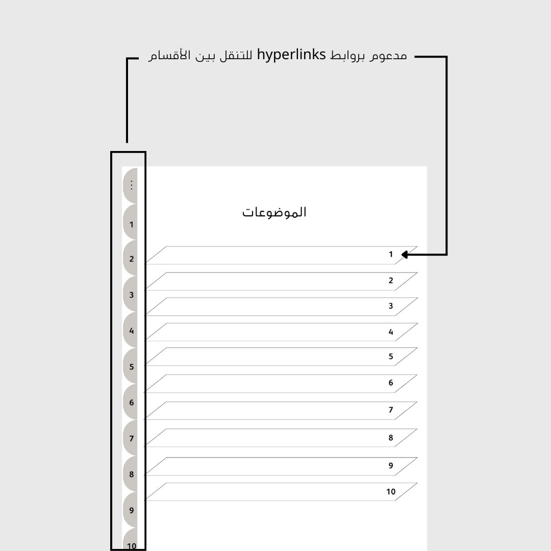 يحتوي على 10 اقسام (tabs) مدعومة بالروابط التفاعلية المتشعبة لتسهل عليك عملية التنقل بين الأقسام-