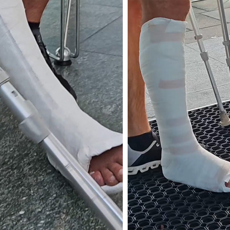 He gets out of a taxi and crutches along the entrance to the registration area, where he has to wait a short while leaning on his crutches. He then goes on to have an X-ray. When he comes back out of the locker room, he hops over to a chair in the waiting area. He holds his split cast in his hand and therefore cannot use his crutches correctly. Apparently the cast was removed briefly so that an x-ray could be taken.