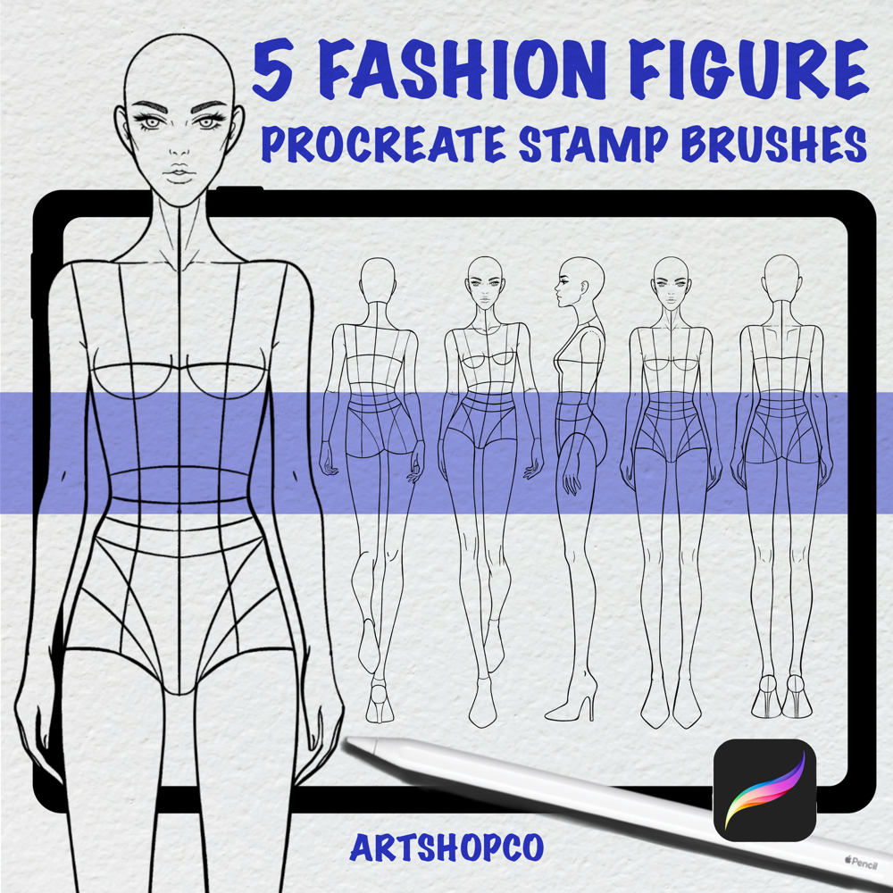- Procreate stamp brushes:** Quickly insert professionally proportioned fashion figures into your designs.