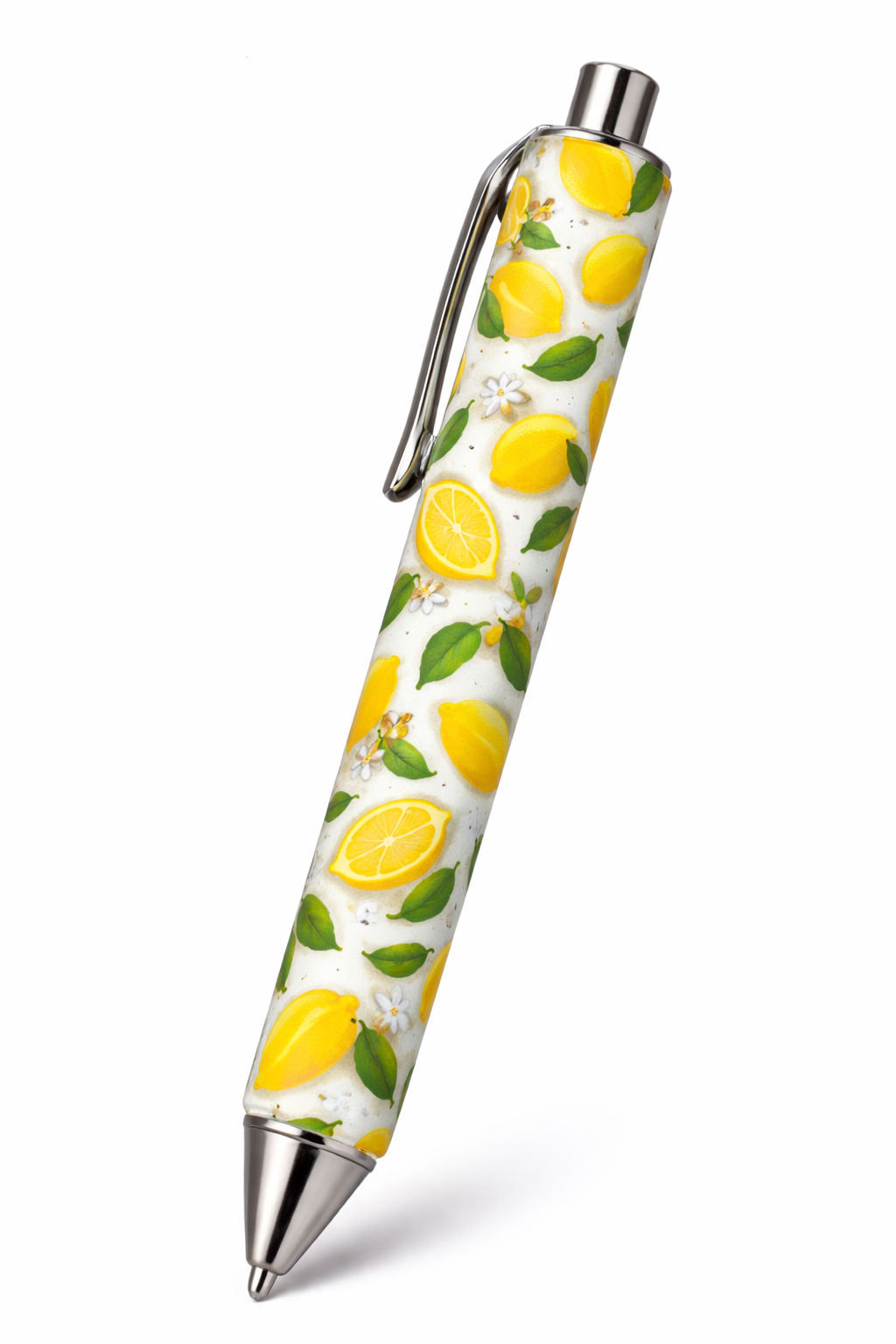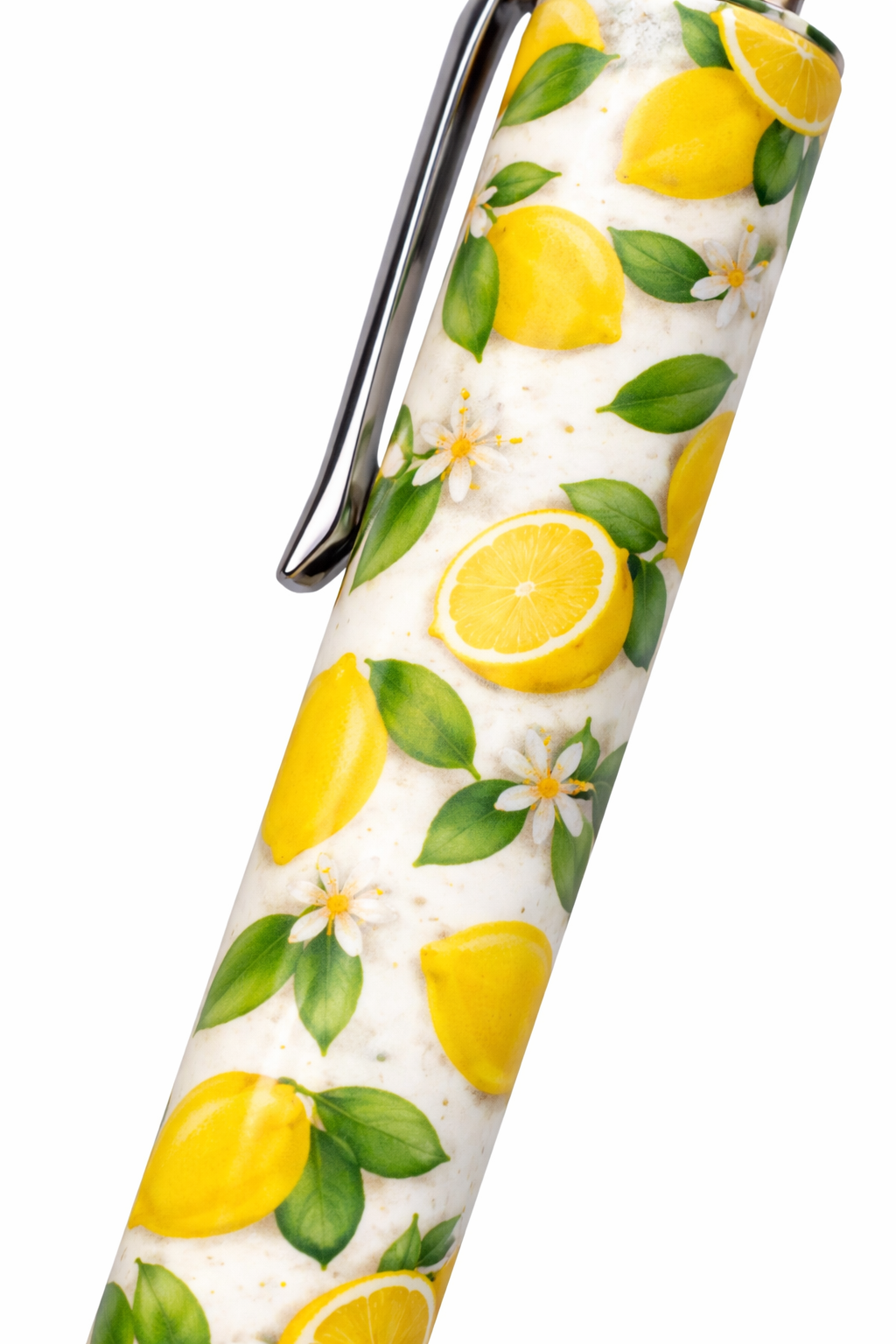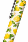 This vibrant design features fresh yellow lemons, green leaves, and delicate white flowers on a soft background, creating a cheerful summer-inspired look.