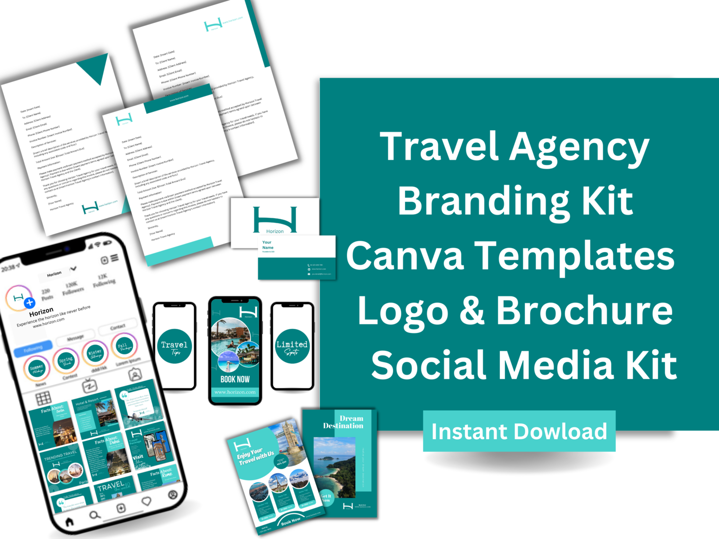 Looking for an easy way to create a professional and polished brand presence for your travel agency? Our premade branding kit has everything you need! Our kit includes Canva templates for business logos, brochures, and social media, as well as all the elements you need to create a cohesive brand identity and marketing materials. With our kit, you'll save time and hassle while still creating a brand that stands out.