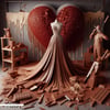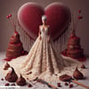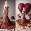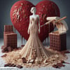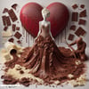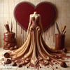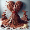 A life-sized couture gown sculpted from chocolate, with delicate shards cascading to the floor from the artist’s intricate carvings. Surrounding the model are chunks of milk, dark, and white chocolate, along with chiseling tools. The backdrop, a massive red heart trimmed in diamonds and dripping with chocolate, creates a dreamy fusion of edible art and fantasy.