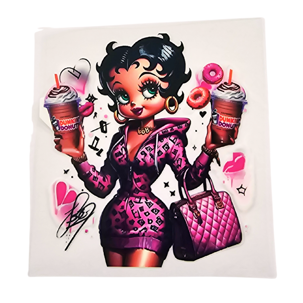 Start your day the Miss B way—with coffee, donuts, and style! The Miss B with Donut & Latte Coffee Decal Wrap is designed to fit 16 oz Libbey glass cans, tumblers, and coffee cups, featuring the fabulous Miss B enjoying her latte and sweet treat. It’s the perfect wrap for coffee lovers who crave a little sass with their sip.