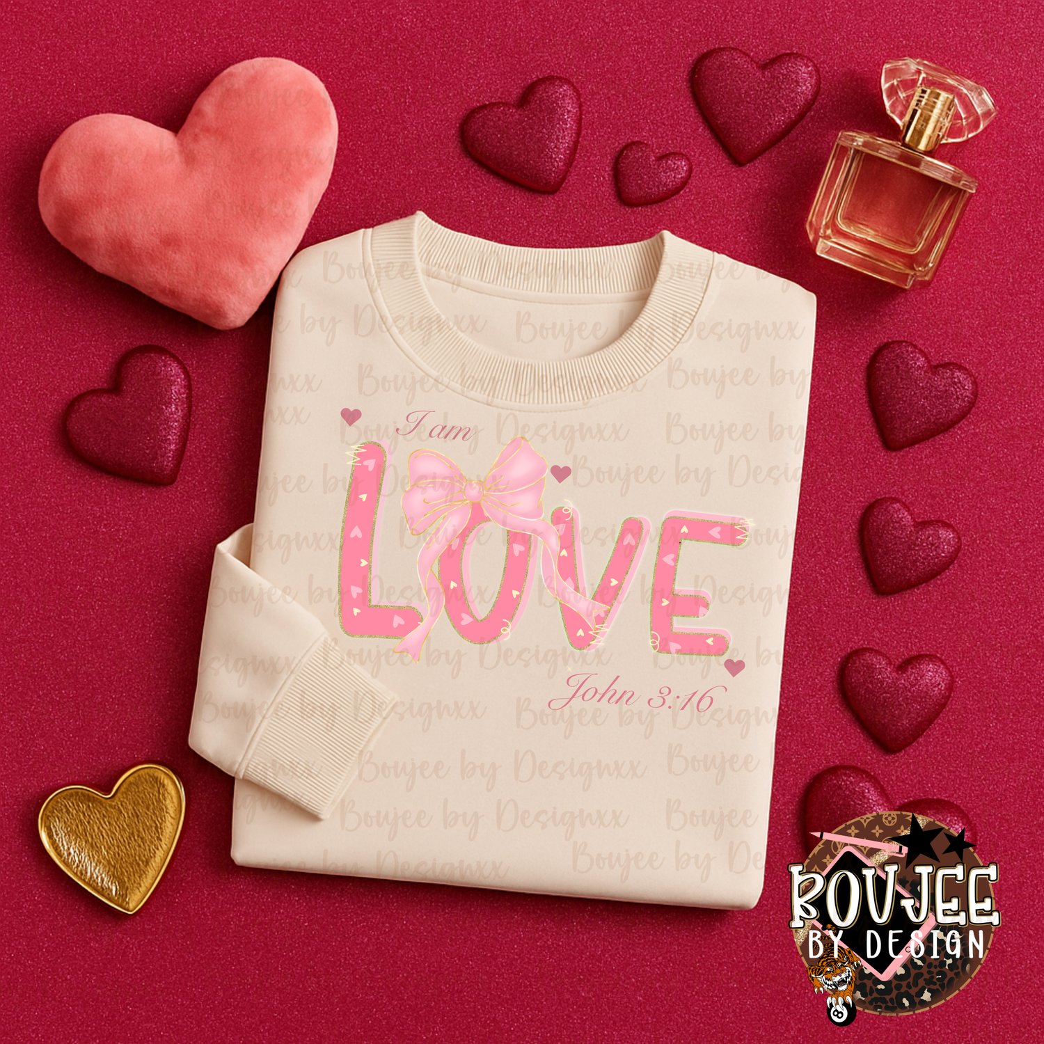 This soft, feminine Christian Valentine design features the word LOVE in a pink bow-inspired style with tiny hearts and glittery accents. A gentle reminder of God’s love, highlighted with John 3:16 — perfect for faith-based drops, church boutiques, and Valentine collections.