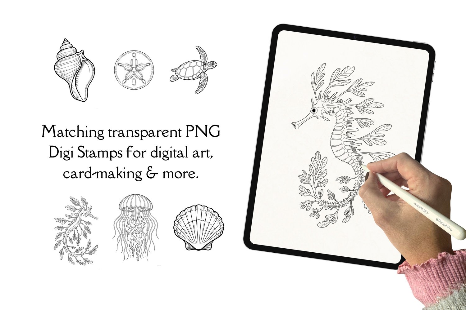 Print and trace onto watercolor paper to paint your own ocean-inspired masterpiece. Or print directly onto watercolor paper and paint right over the outlines — the greyscale versions are especially lovely for this. Use the PNG digi stamps in Procreate, Canva, or any digital art app for layouts, cards, and journaling pages.