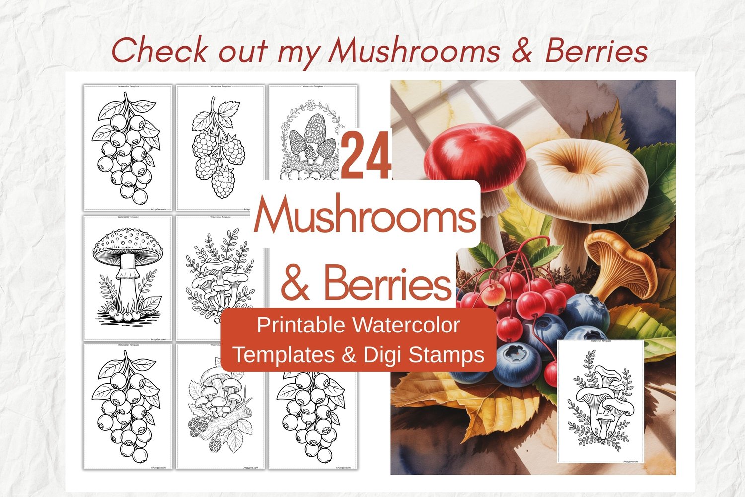 42 watercolor template pages (black + greyscale versions) as printable PDFs, plus 42 matching transparent PNG digi stamps for digital use.