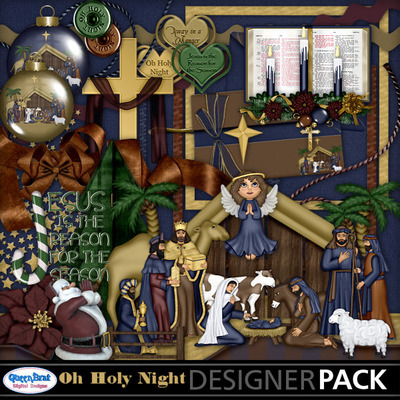 This kit depicts the birth of Christ as told in the Bible. Included are the baby Jesus, Mary, Joseph, the Three Wise Men, the two Shepherds, a stable, a cow, a sheep, a donkey, a camel, and an angel. There is also a praying Santa, a Bible, a Cross, and the Christmas Star. The perfect kit for scrapping the Christmas story with your pictures and for making religious Christmas tags.