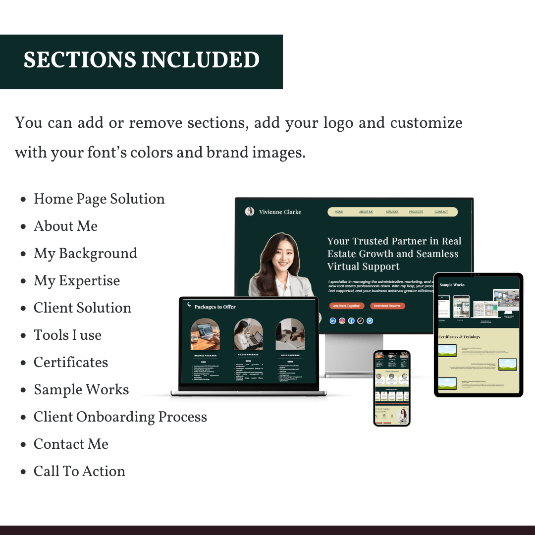 🔹 Pages: Home, About, Education, Work Experience, Services, Skills & Expertise, Tools, Work Samples, Packages, Certifications, Onboarding Process, Testimonials, Client Solution, Contact CTA.