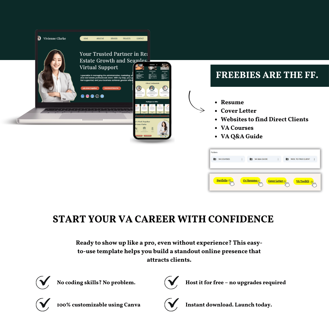 - FREE: Resume, Cover Letter, Websites to find Direct Clients, VA Courses, and VA Q&A Guide.
