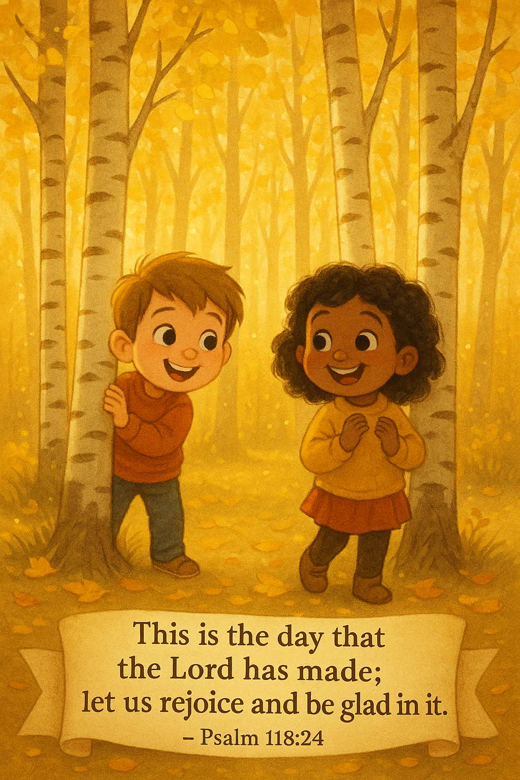Celebrate the joy of the moment with this Rejoice Today Scripture Poster, featuring two cheerful children playing among golden birch trees in a glowing autumn forest. Anchored in Psalm 118:24, this printable radiates warmth, gratitude, and spiritual celebration β perfect for Thanksgiving bundles, homeschool walls, or ministry kits.