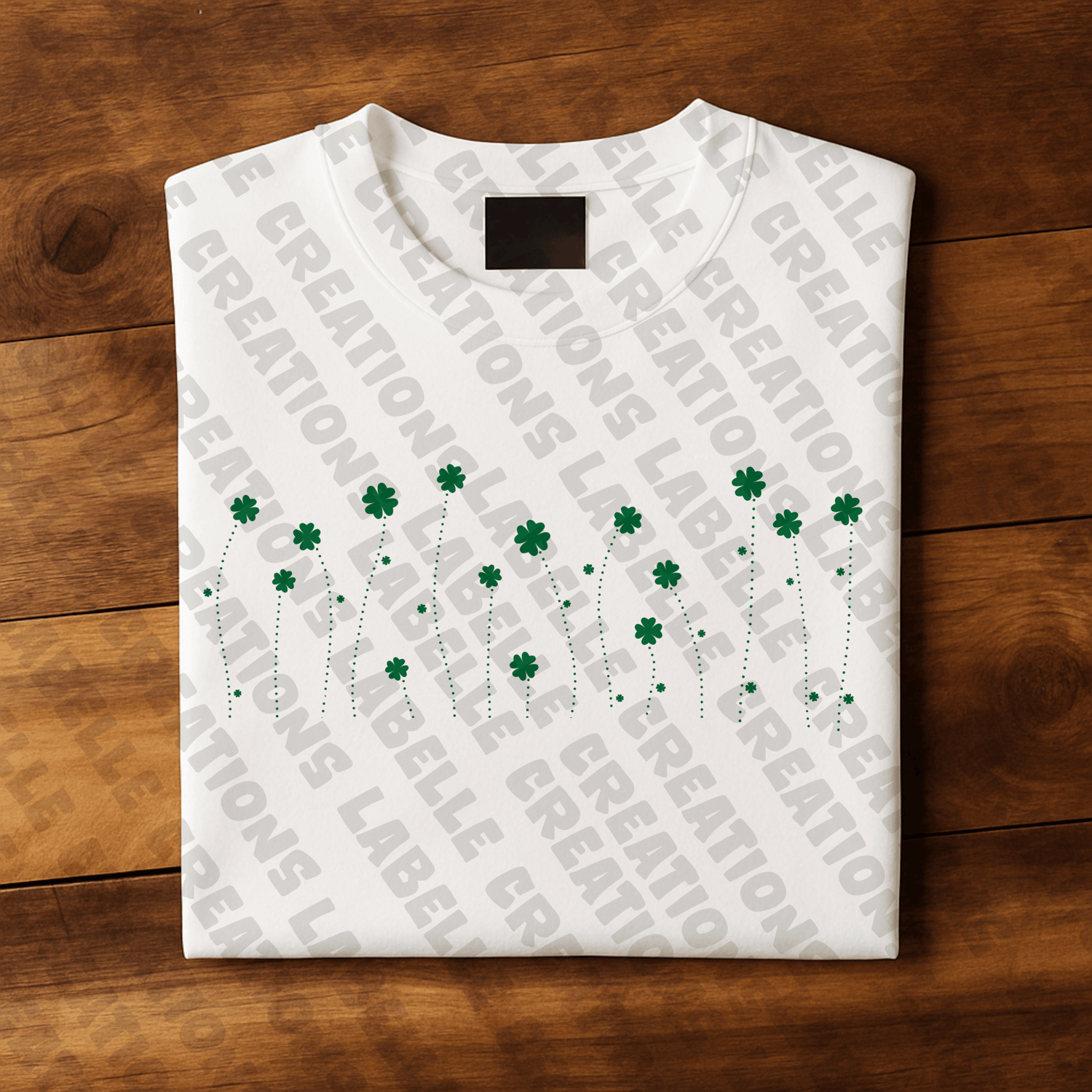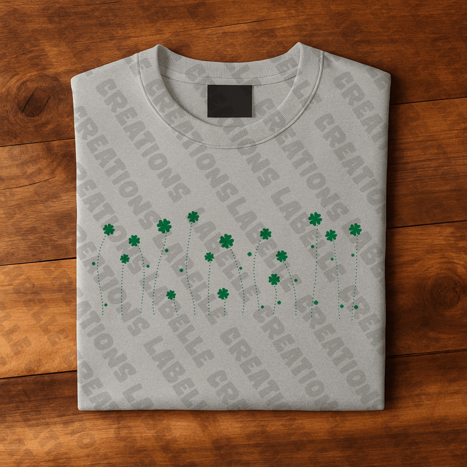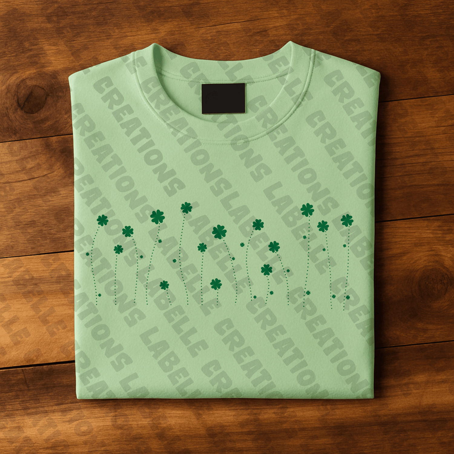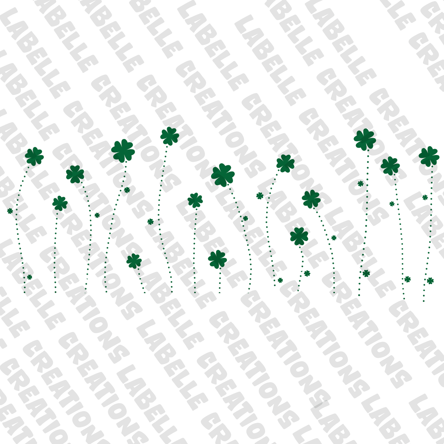 floating and rising four-leaf clovers in varying sizes and shades of green. The clovers appear to drift upward like festive confetti, creating movement and a playful, celebratory feel. Set against a dark background for strong contrast, the vibrant greens stand out, making the design eye-catching and perfect for St. Patrick’s Day–themed products, apparel, or tumbler wraps. The overall look blends festive charm with a clean, modern style ideal for seasonal prints and decorations.