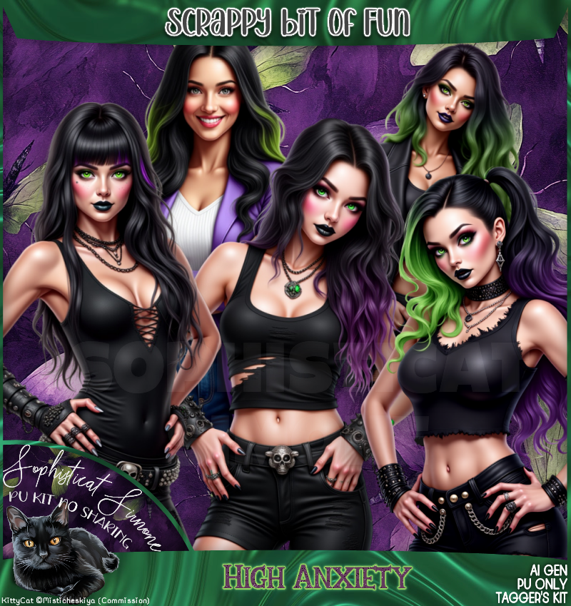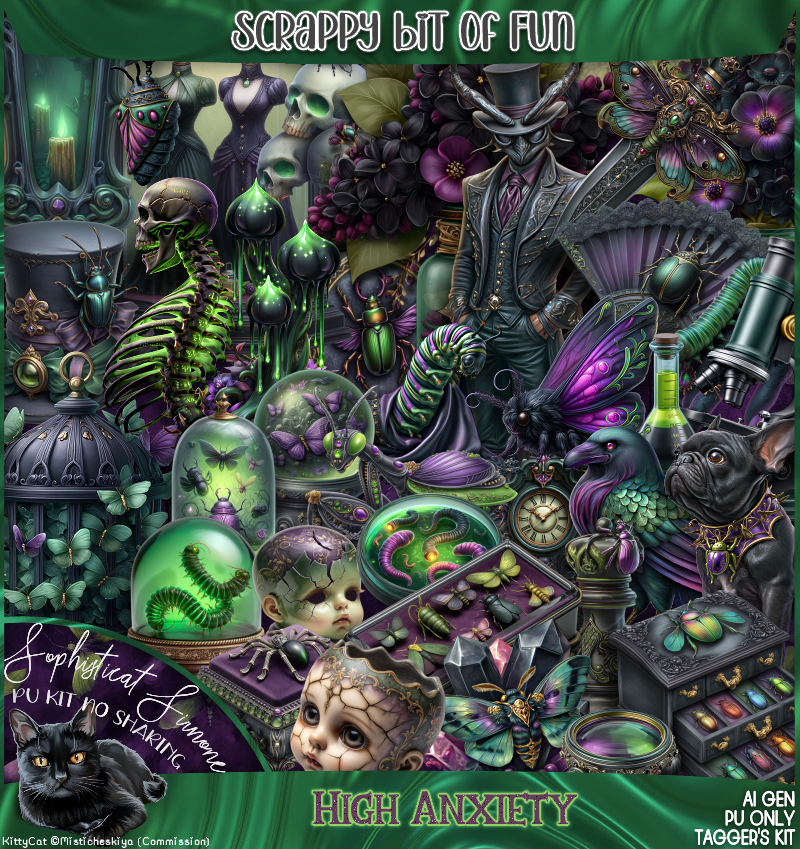 Step into a world where whimsy tangles with the wonderfully strange. High Anxiety is a moody, and delightfully chaotic digital scrap-booking kit. This kit is packed with 300 elements, 5 frames, 47 papers, 20 word art pieces, and 5 tubes.
