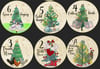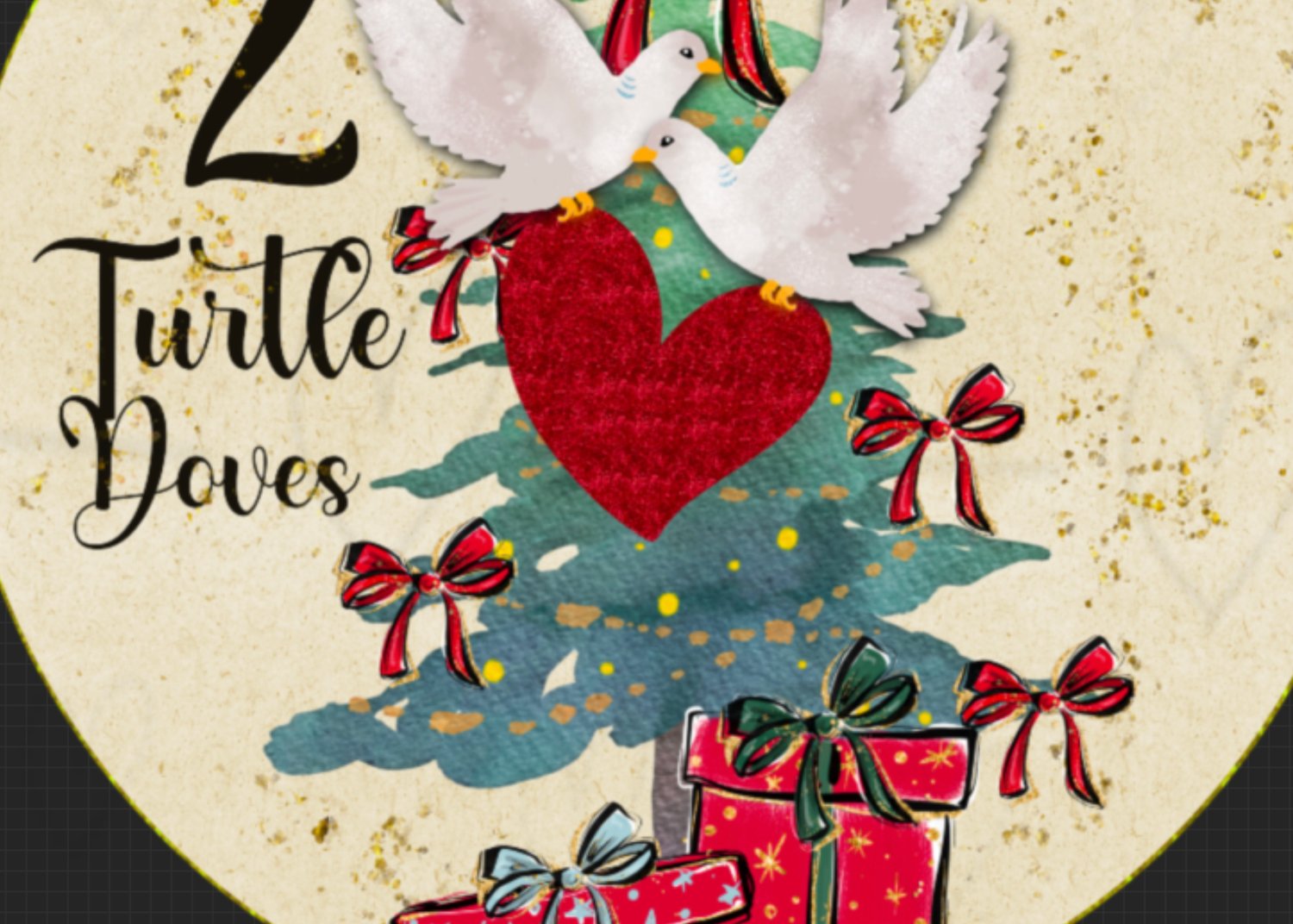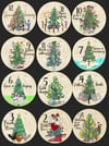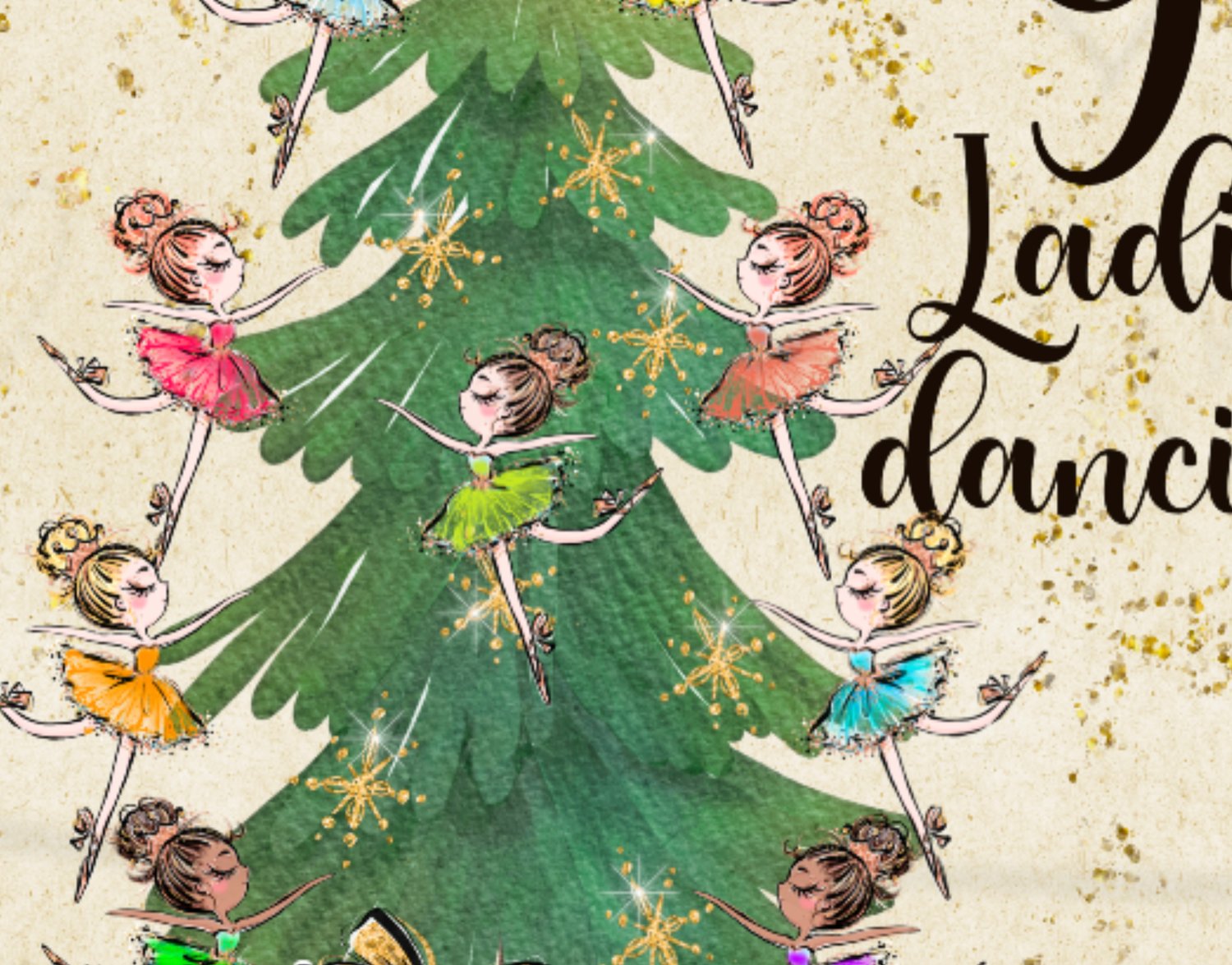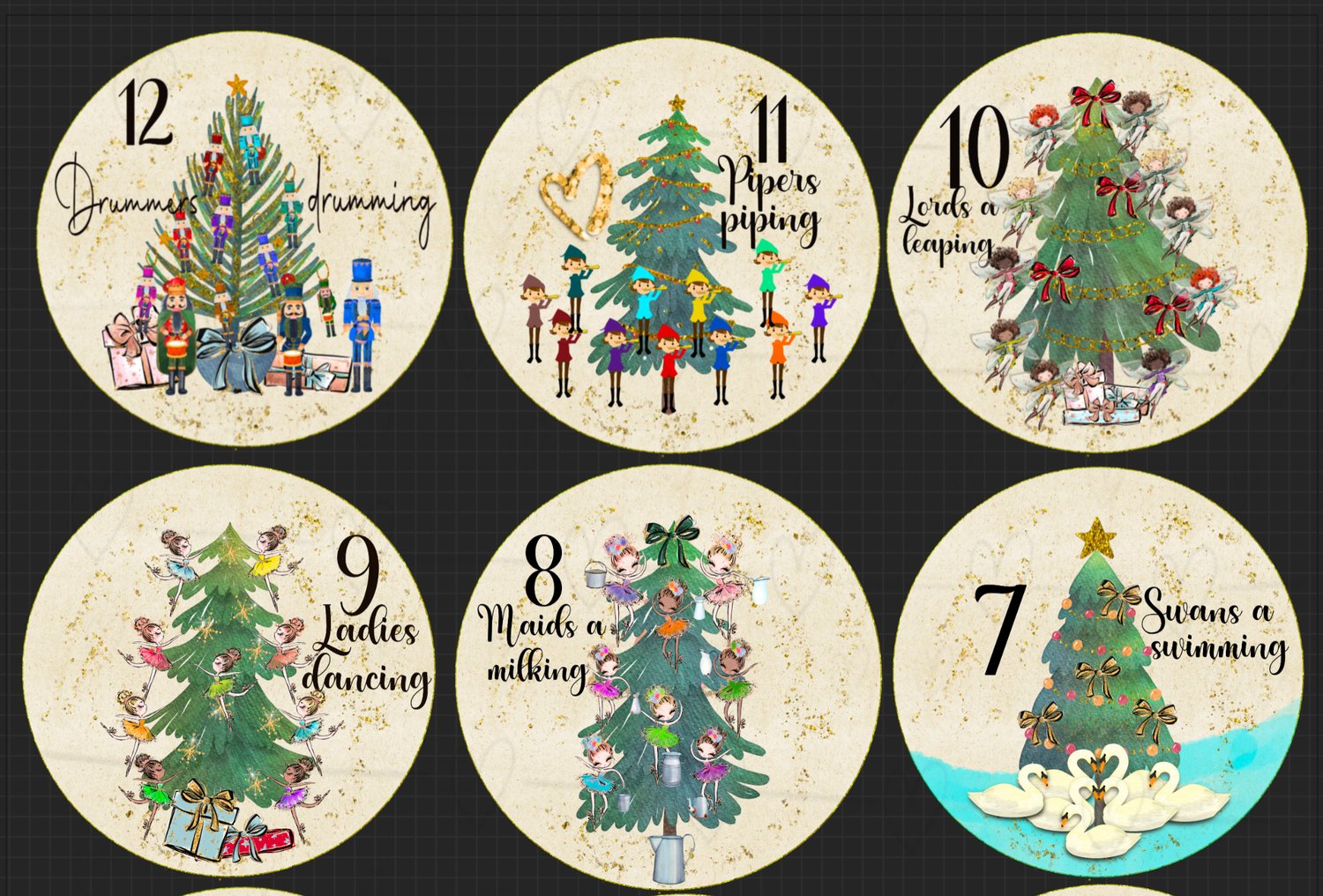 Each bauble design depicts one of the 12 days of Christmas, set around a watercolour Christmas tree. Lots of gold elements.