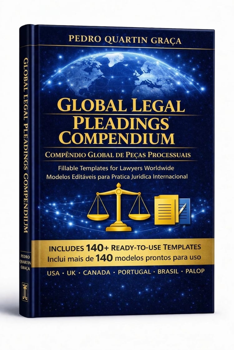 The Global Legal Pleadings Compendium is the most comprehensive bilingual collection of ready-to-use legal pleading templates ever assembled in a single reference volume. It bridges the two great legal traditions of the world — the civil-law (Romano-Germanic) tradition of Portugal, Brazil, and the Portuguese-speaking African countries (PALOP), and the common-law tradition of the United States, the United Kingdom, Canada, Australia, New Zealand, Hong Kong, South Africa, India, and Singapore — placing them side by side for the first time in one practical, fillable compendium.