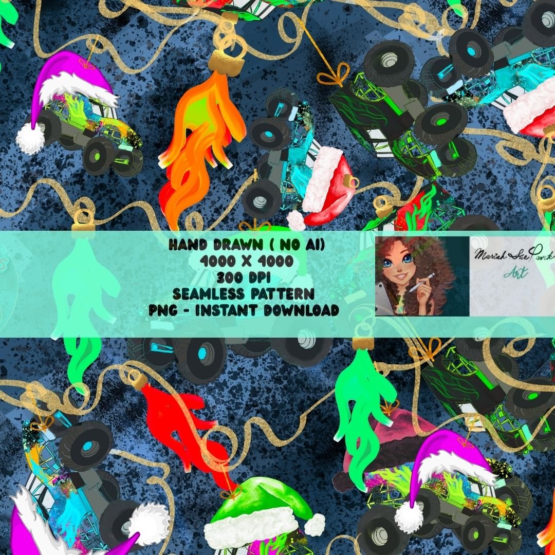 Festive Monster Truck Christmas- String Lights Seamless Pattern