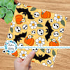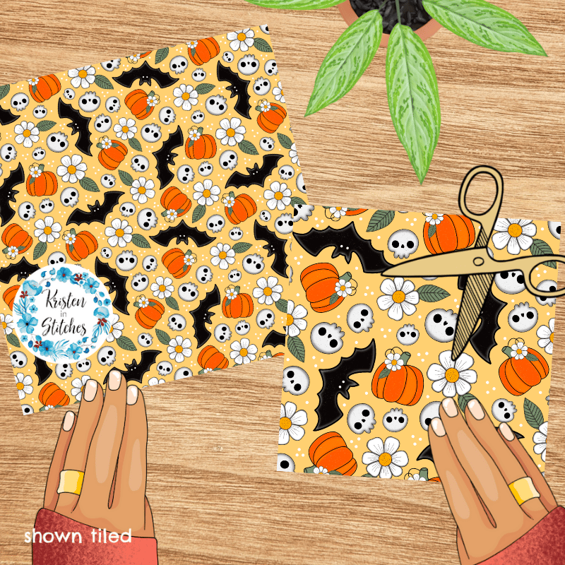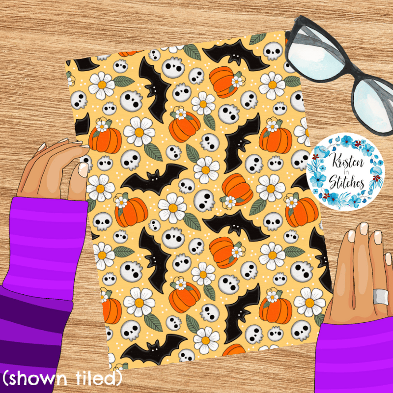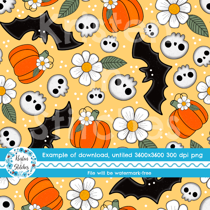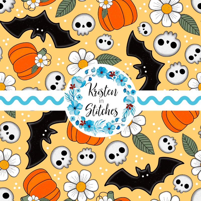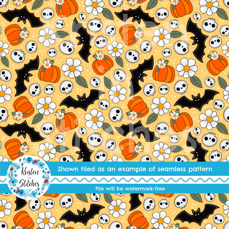Halloween Haunts Pumpkins Bats Skulls Daisy Flowers Seamless Pattern