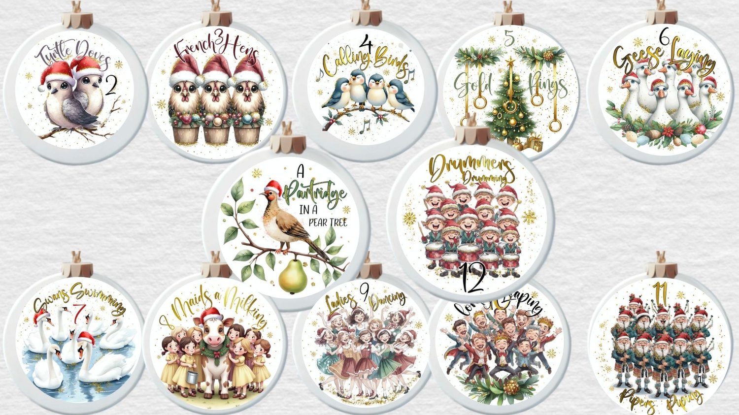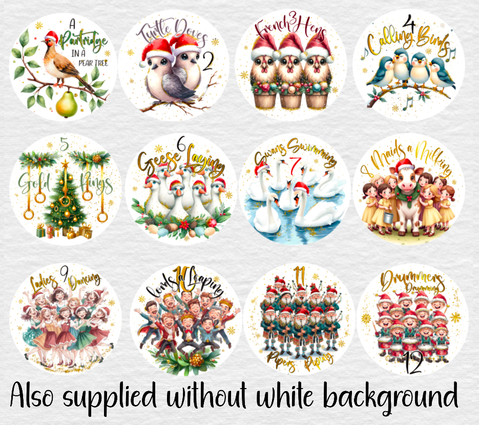 12 Days of Christmas, whimsical, 12 round and 12 without background – 24 PNGs (Instant Digital Download)