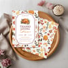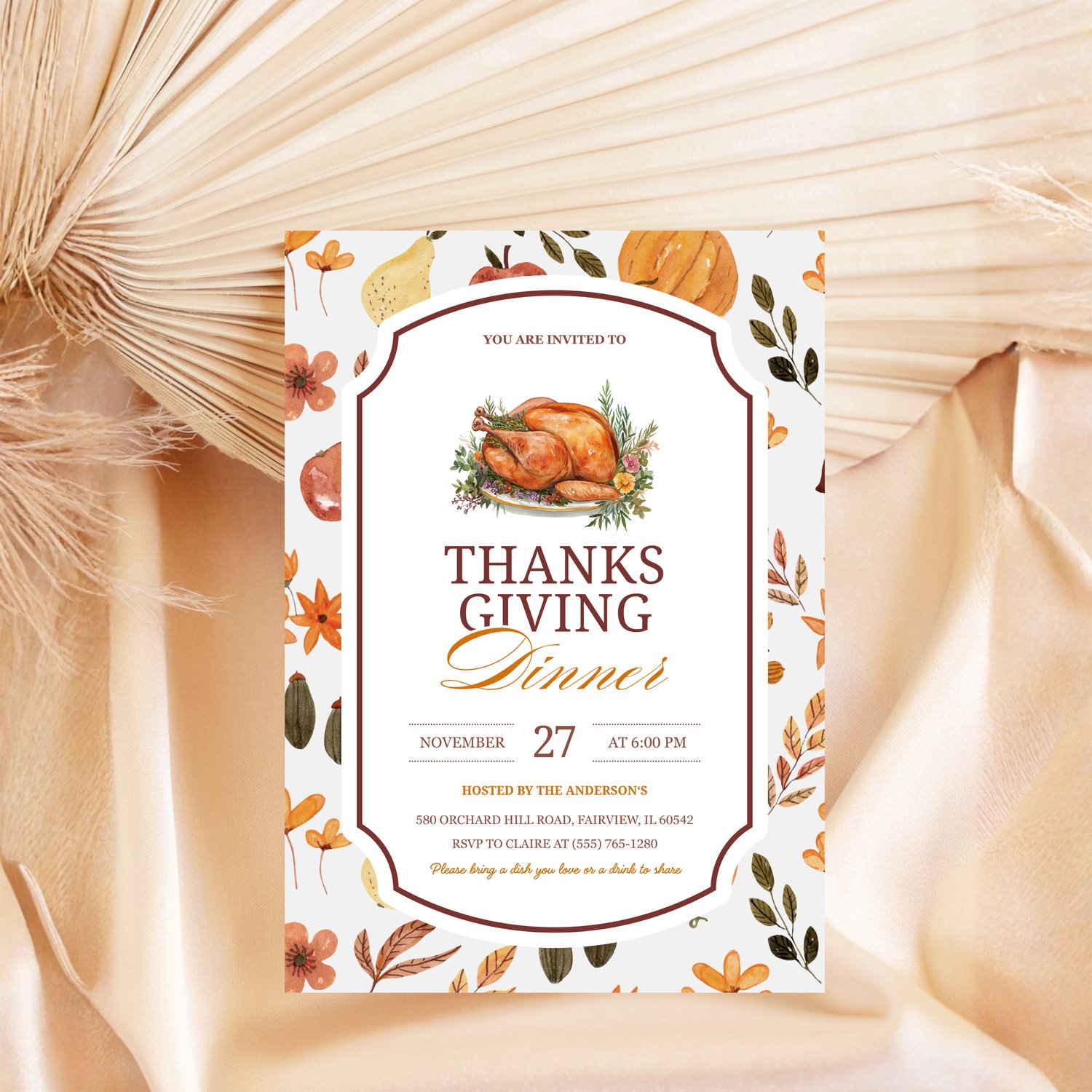 Featuring warm autumn hues, watercolor pumpkins, and delicate ribbon accents, this friendsgiving invite captures the heart of the season — good food, great company, and heartfelt memories.