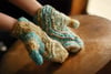 These are constructed in the round in any gauge, from the thumbs out, and come in 3 different versions: short fingerless, long fingerless, and full mittens.