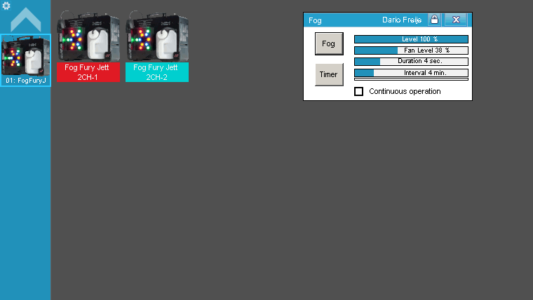 Con el Botón de “Fog” disparan humo mientras que esté presionado el botón. Al soltar apaga. Si activan el box de “Continuos Operation” queda apretado el botón por lo que largará humo hasta que lo vuelvan a presionar.