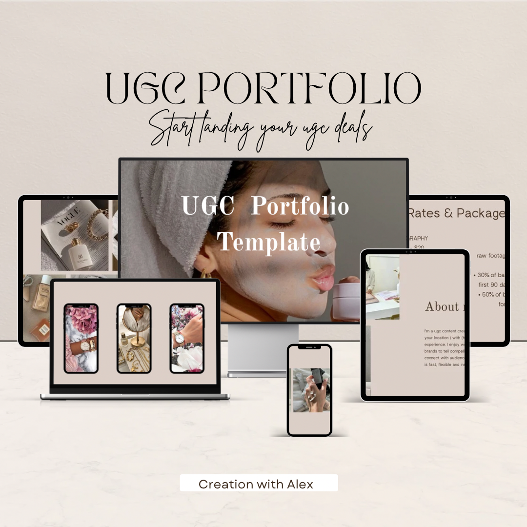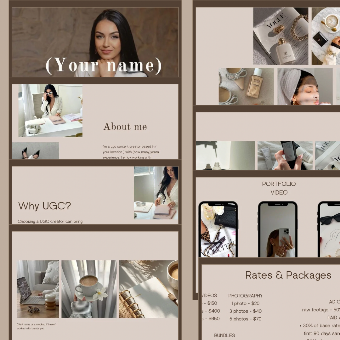 Easily upload your own photos into the frames, allowing you to resize, move, or even remove them as desired. Personalise the texts by editing their fonts, colours, sizes..When it comes to standing out as a UGC creator, your portfolio is everything.