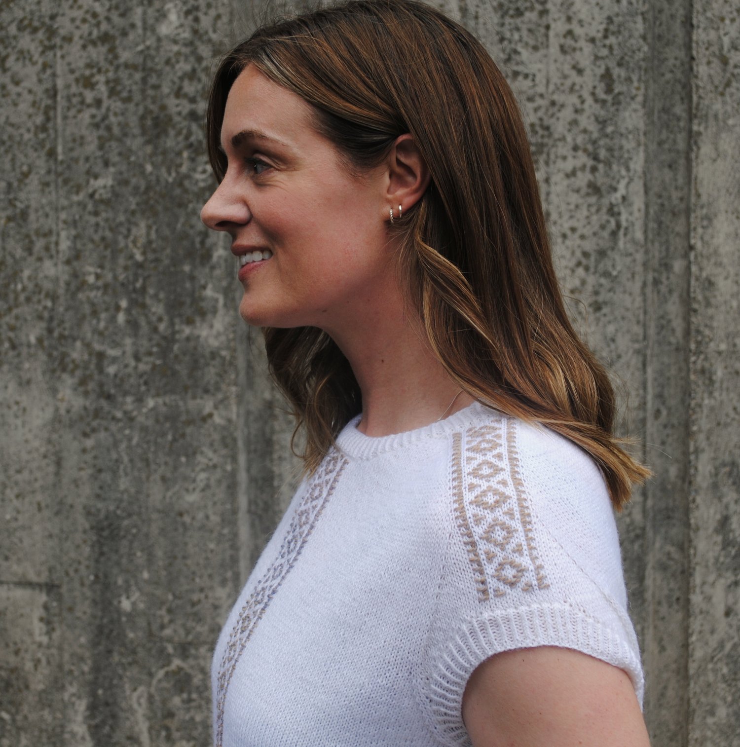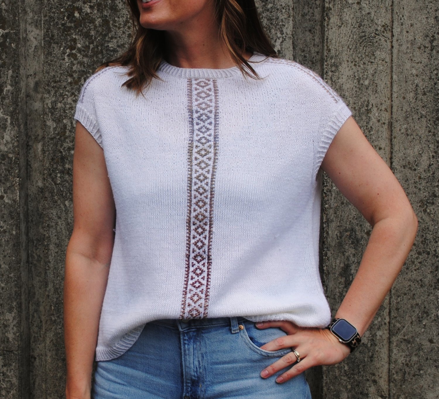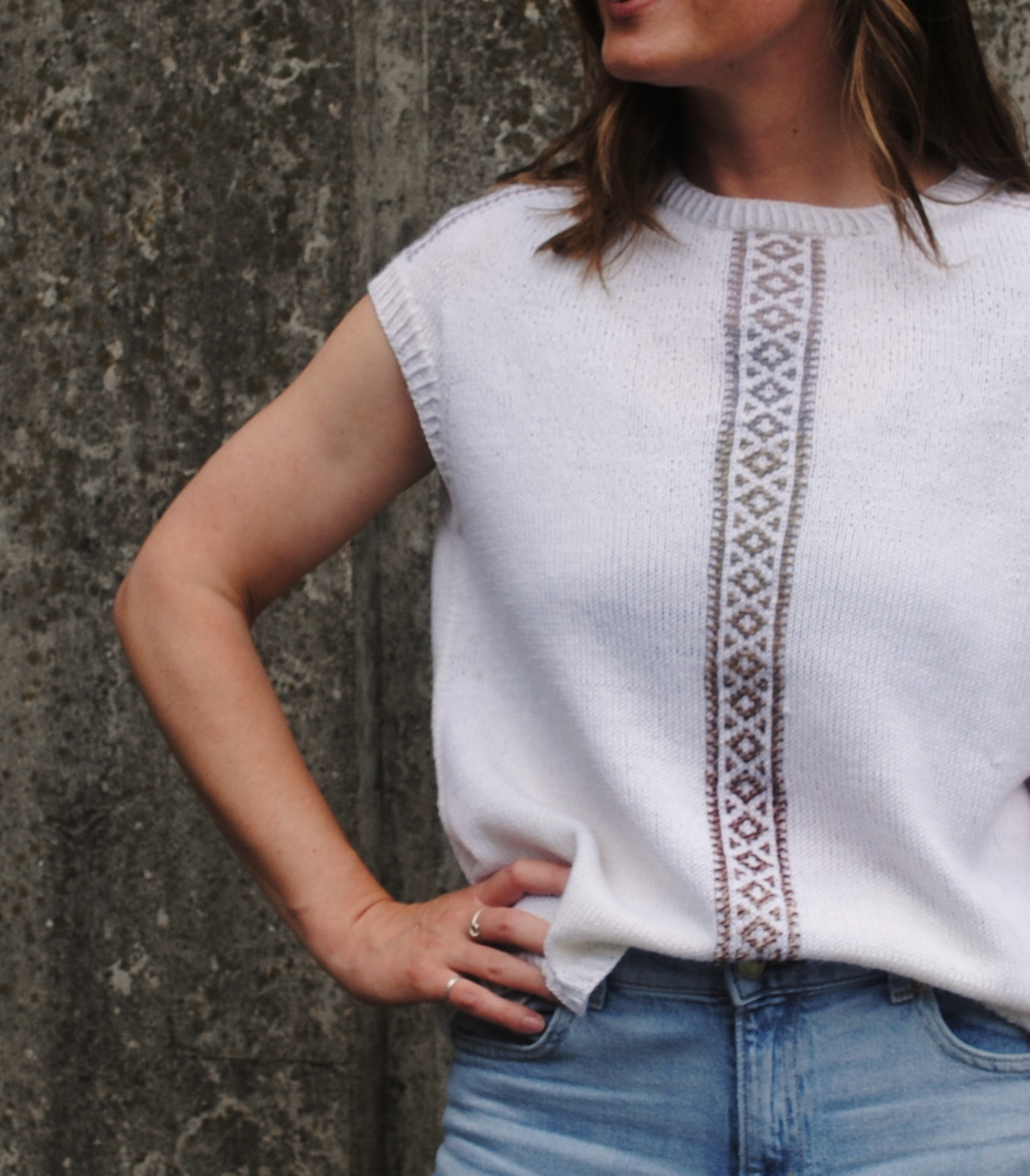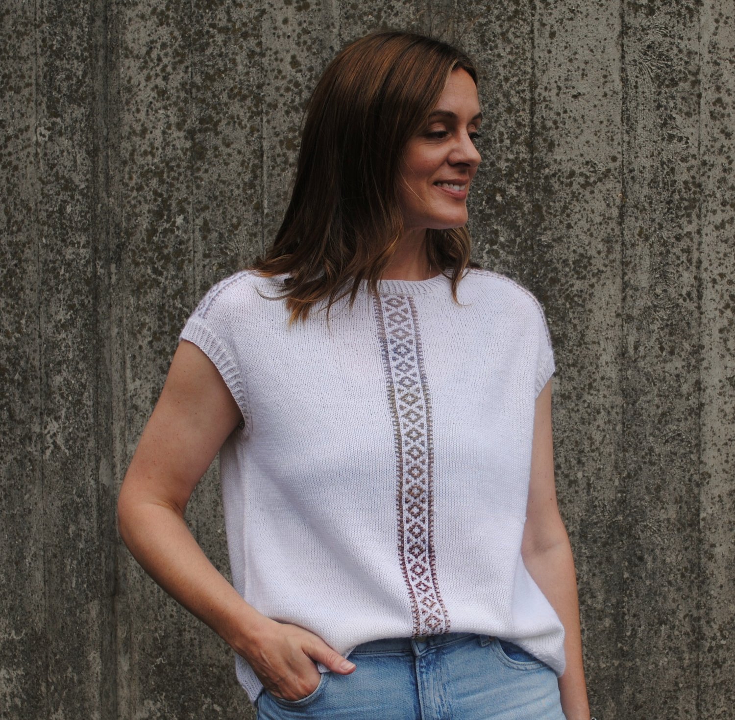 This is a relaxed-fit spring/summer garment, featuring panels of Inlay Knitting down each shoulder and down the centre front. The name Medina is a reflection of the source of inspiration for the design; a few years ago I was lucky enough to visit Marrakesh and exploring the medina – the old, walled part of the North African city – is one of my favourite memories. The Inlay Knitting panels are inspired by the Moroccan fretwork panelling I saw decorating many of the buildings there.