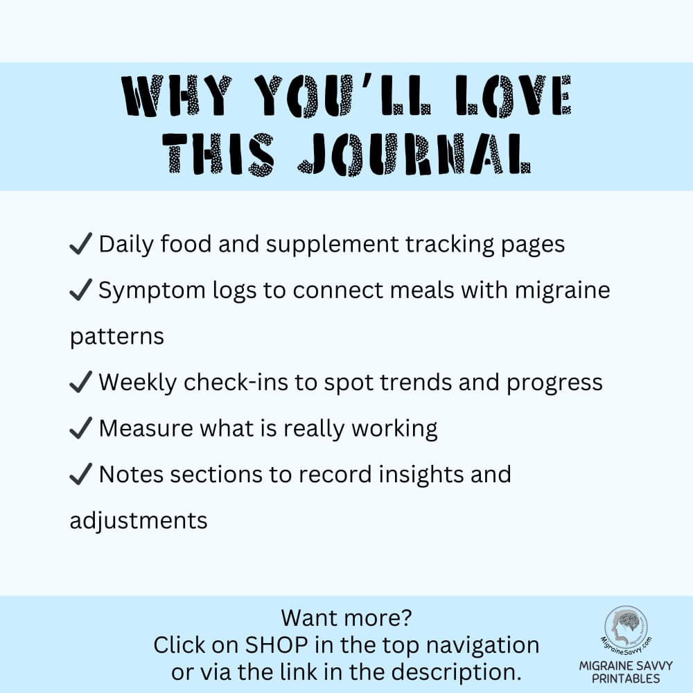 This journal gives you a simple, structured way to test foods and supplements over 8 weeks so you can identify your unique migraine triggers and discover what really helps.
