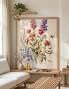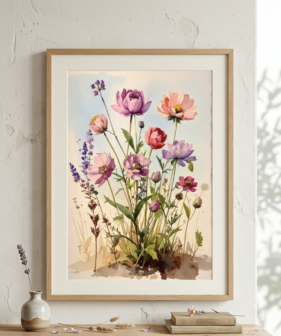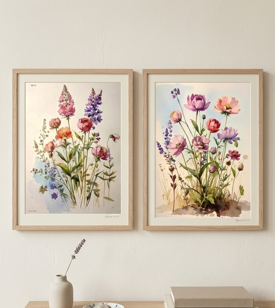 Elevate your home decor with this stunning set of two unique watercolor paintings. This bundle features a harmonious blend of delicate cosmos, elegant lupines, and lush peonies, designed to work perfectly side-by-side or in different areas of the same room.