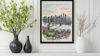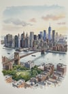This image beautifully illustrates a watercolor-style depiction of New York City, capturing the iconic Brooklyn Bridge spanning across the East River with Manhattan’s towering skyline in the background. The artwork highlights the city’s blend of modern skyscrapers and historic buildings under a softly painted sky tinged with warm hues of sunset. Boats glide along the calm river, while the surrounding neighborhoods and lush green park areas add a touch of tranquility to the bustling urban scene. The detailed brushwork and gentle color palette evoke a sense of both vibrancy and calm, perfectly encapsulating the timeless charm of New York.