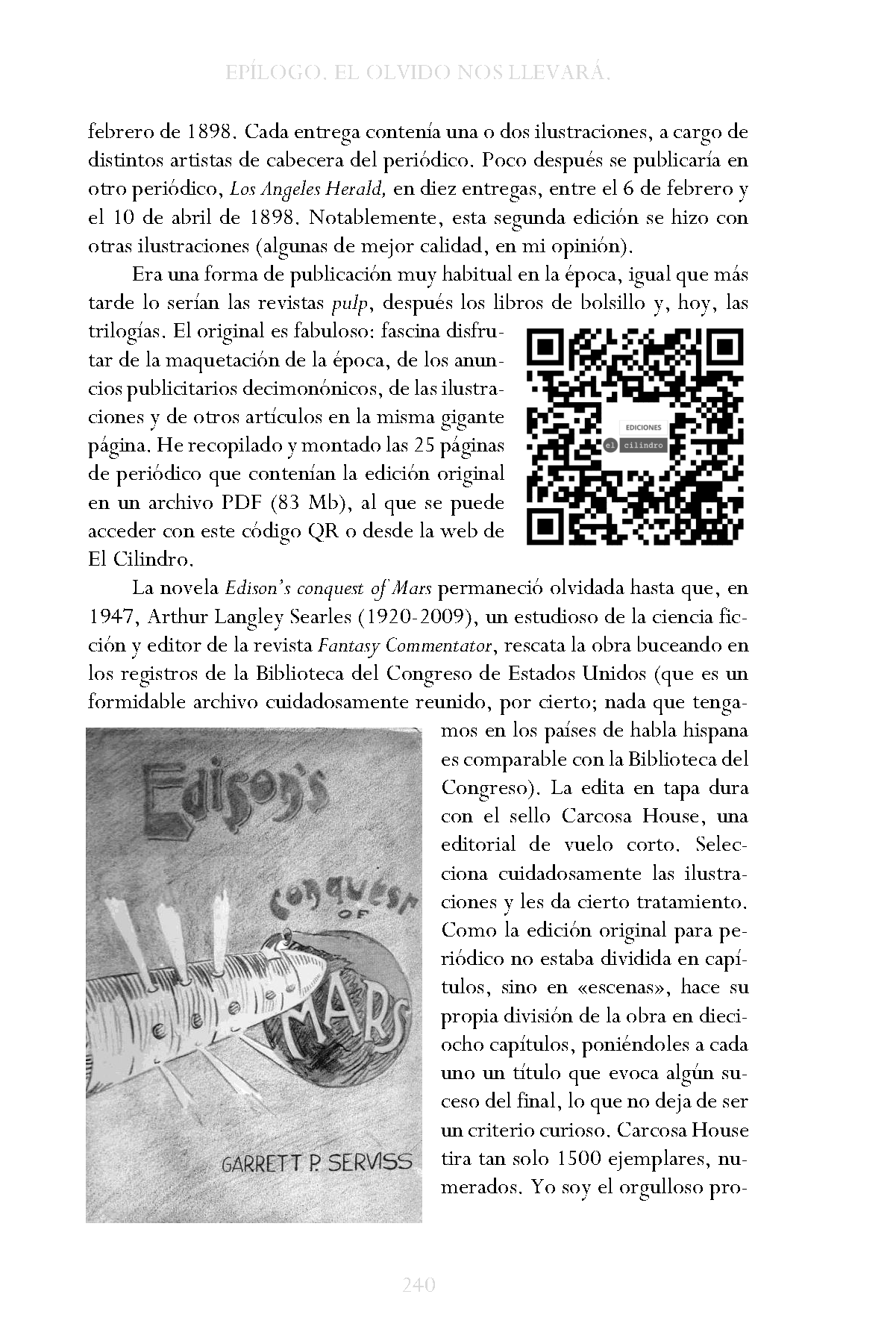 Ésta es la primera traducción al español de esta obra apasionante, publicada por entregas en el New York Herald Evening en 1898. Fue un éxito en su tiempo y, desde entonces, se ha reeditado en numerosas ocasiones. Esta edición, cuidada y anotada, incluye las ilustraciones originales y un prólogo de Gabriel Benítez L., quien nos presenta Las otras guerras de los mundos. Esta edición contiene también dos ensayos finales. El primero describe de qué manera Edison conquista Marte es una novela fundamental y pionera para conformar la ciencia ficción moderna. El segundo es una breve biografía del autor, Garrett P. Serviss.