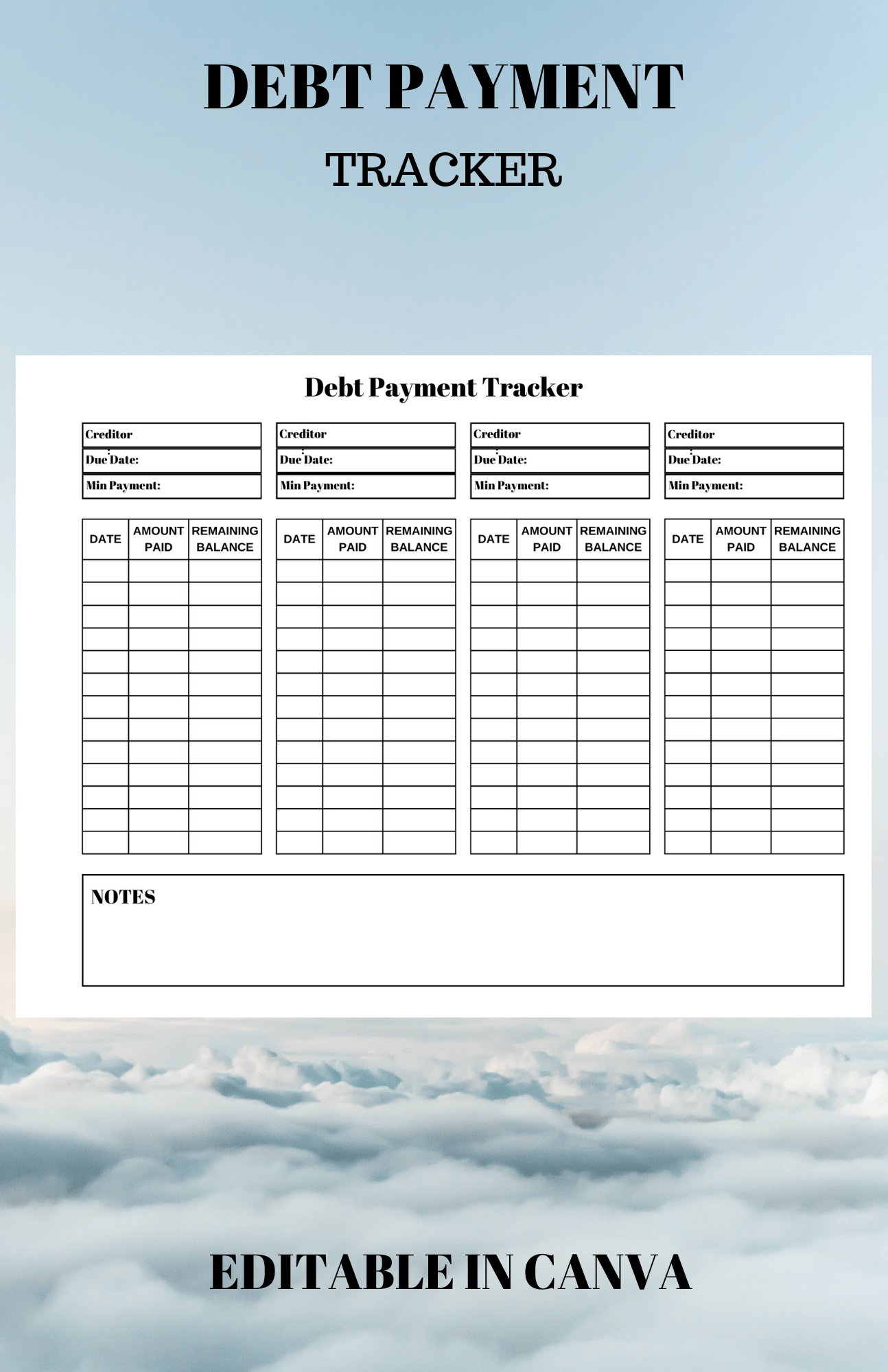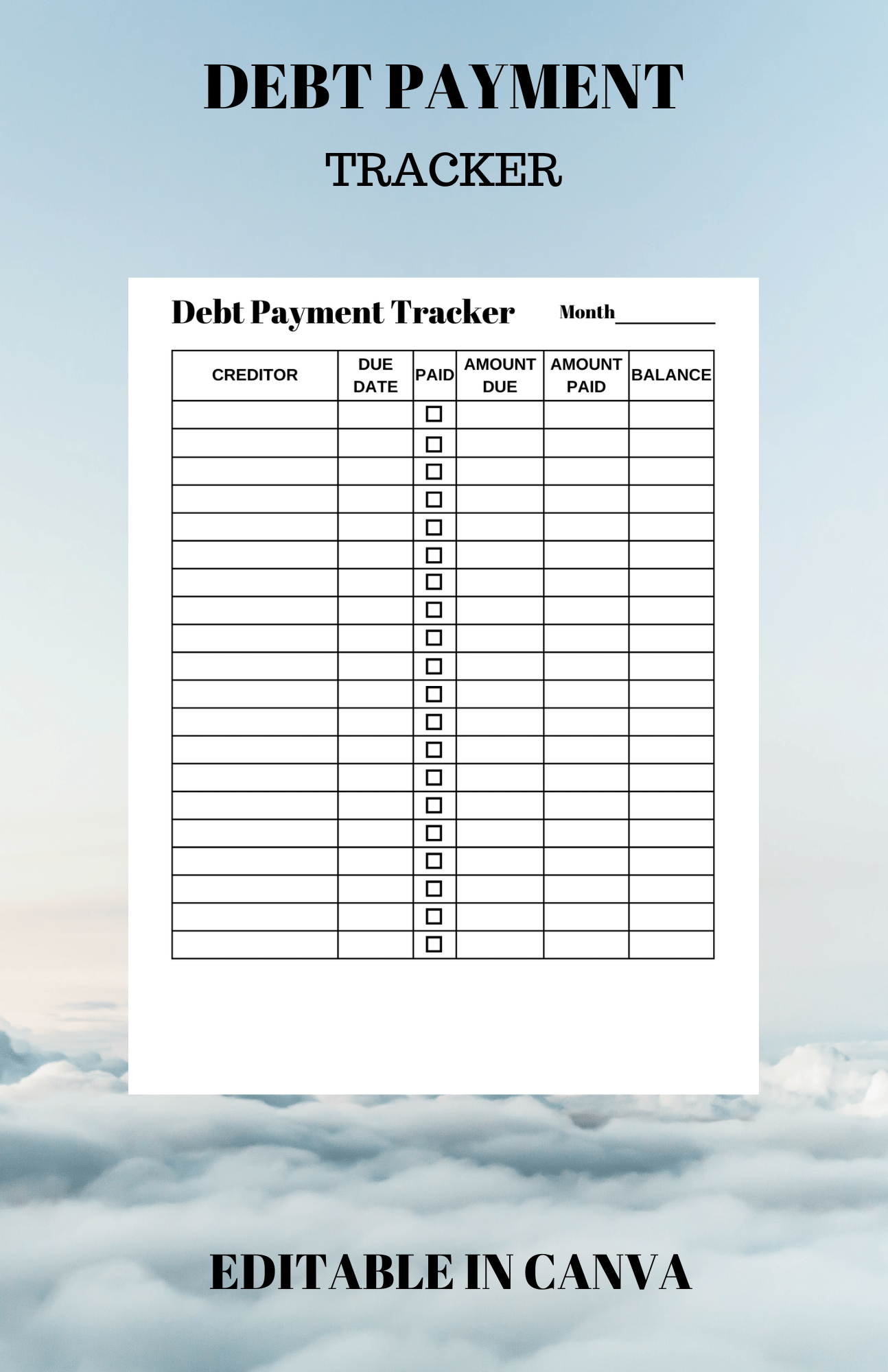 Reach your financial goals this year by staying on top of your debts. With our easy to edit debt payment tracker, you see all of your payments and credit information right in front of you making them easy to track.