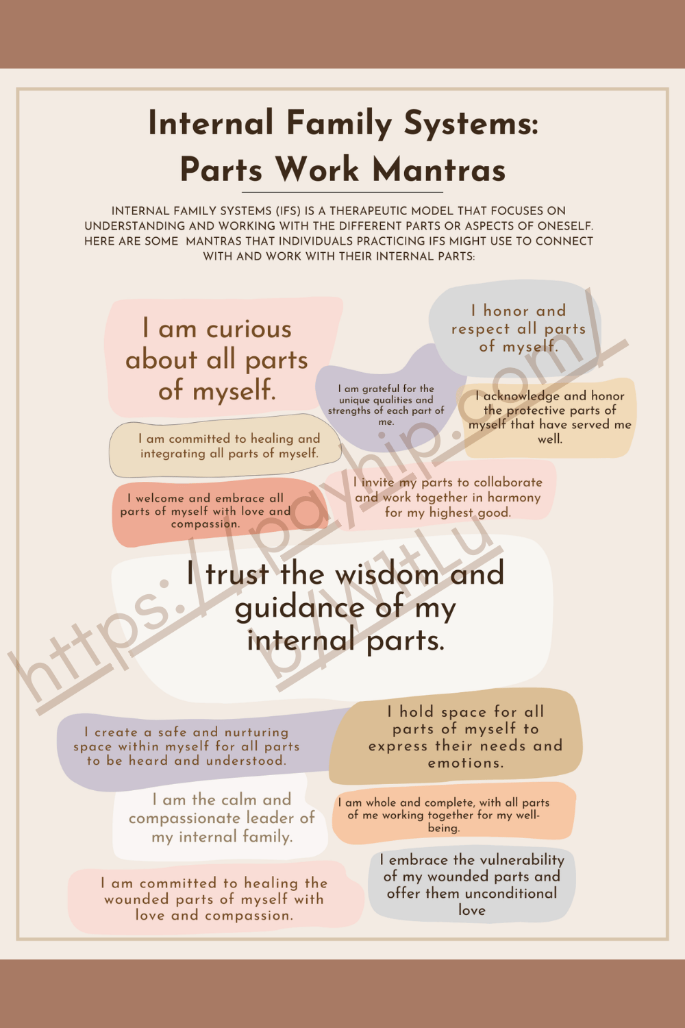 Internal Family Systems (IFS) is a therapeutic model that focuses on understanding and working with the different parts or aspects of oneself. This worksheet offers some mantras that individuals practicing IFS might use to connect with and work with their internal system and parts.
