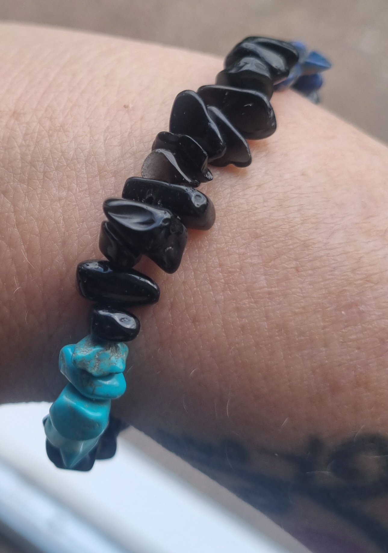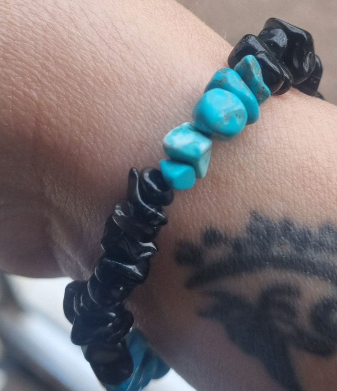 Step up your accessory game with Obsidian Blues, a bold handmade bracelet crafted for those who want style and strength. This striking piece combines the deep protection of obsidian chips, the vibrant pop of turquoise, and the mystical flash of labradorite — creating a bracelet that not only looks incredible but feels powerful to wear.