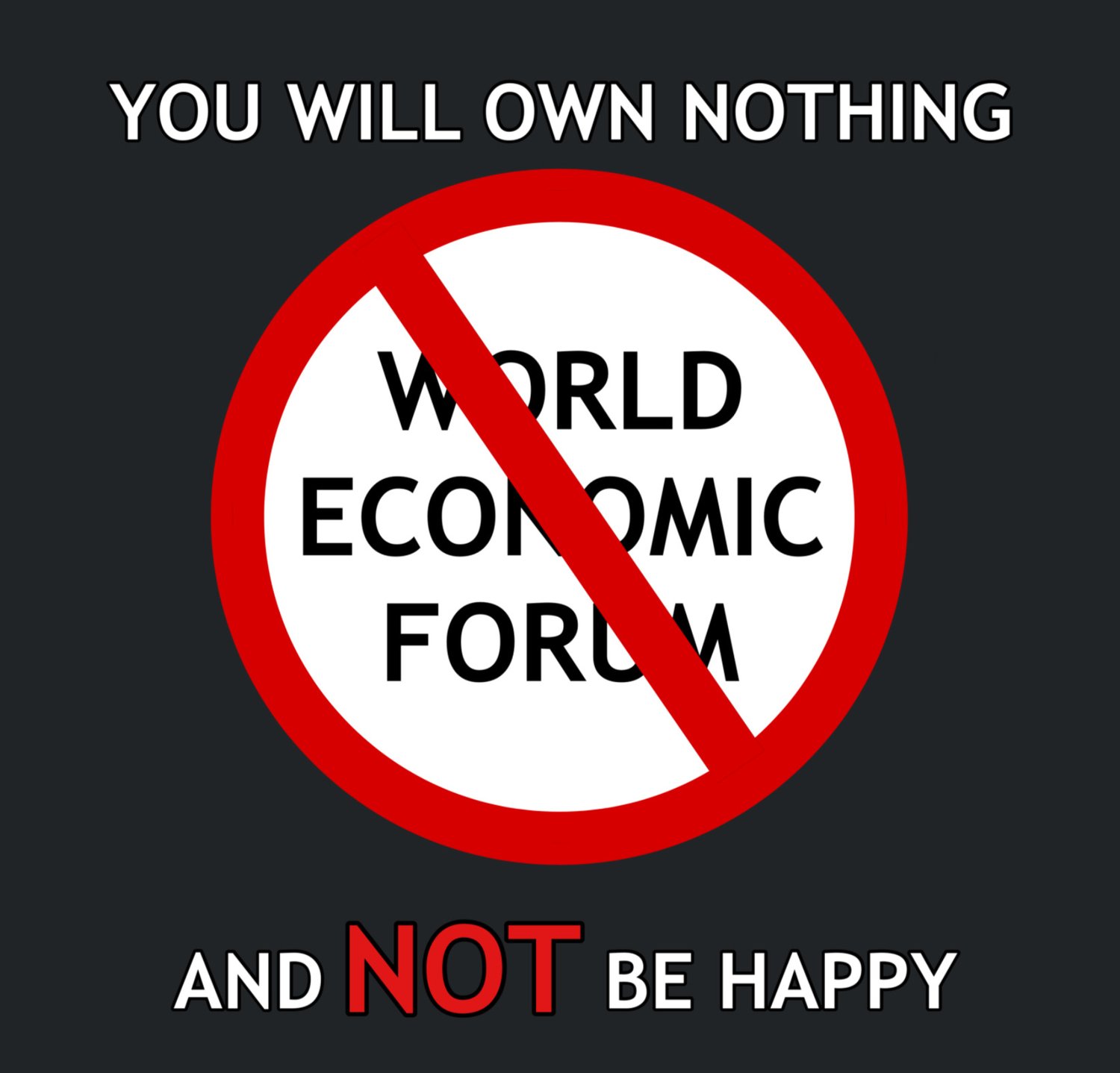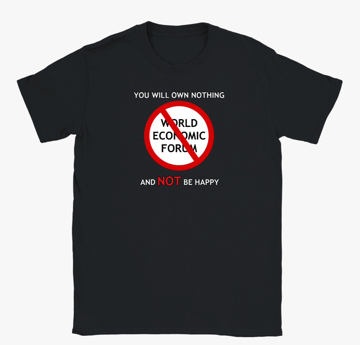 Make a bold statement with this Anti-World Economic Forum T-Shirt. Featuring the striking slogan “You will Own Nothing and NOT be Happy” with a red “No WEF” symbol at the centre, this design offers a clear message of resistance to globalists agendas.