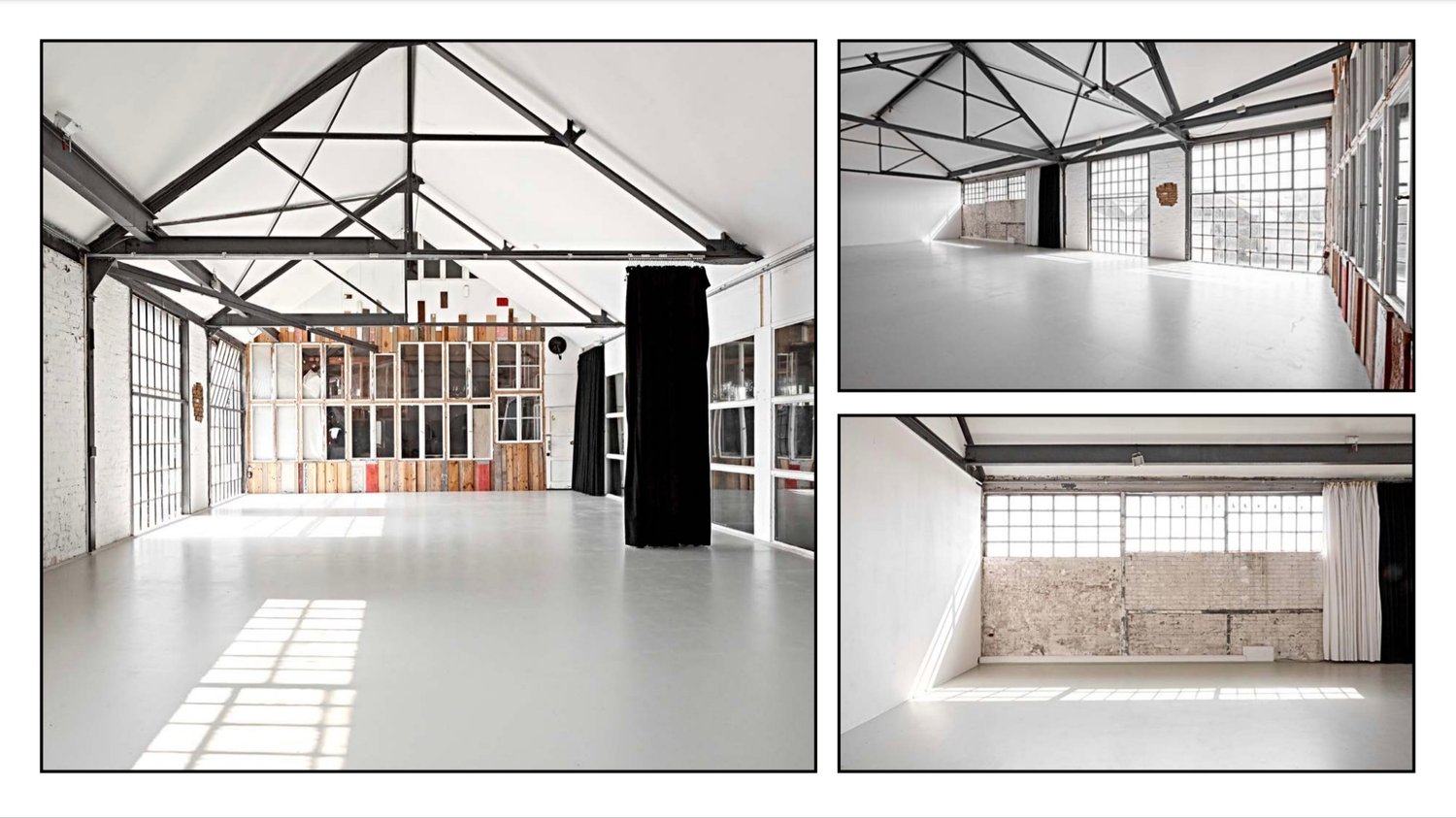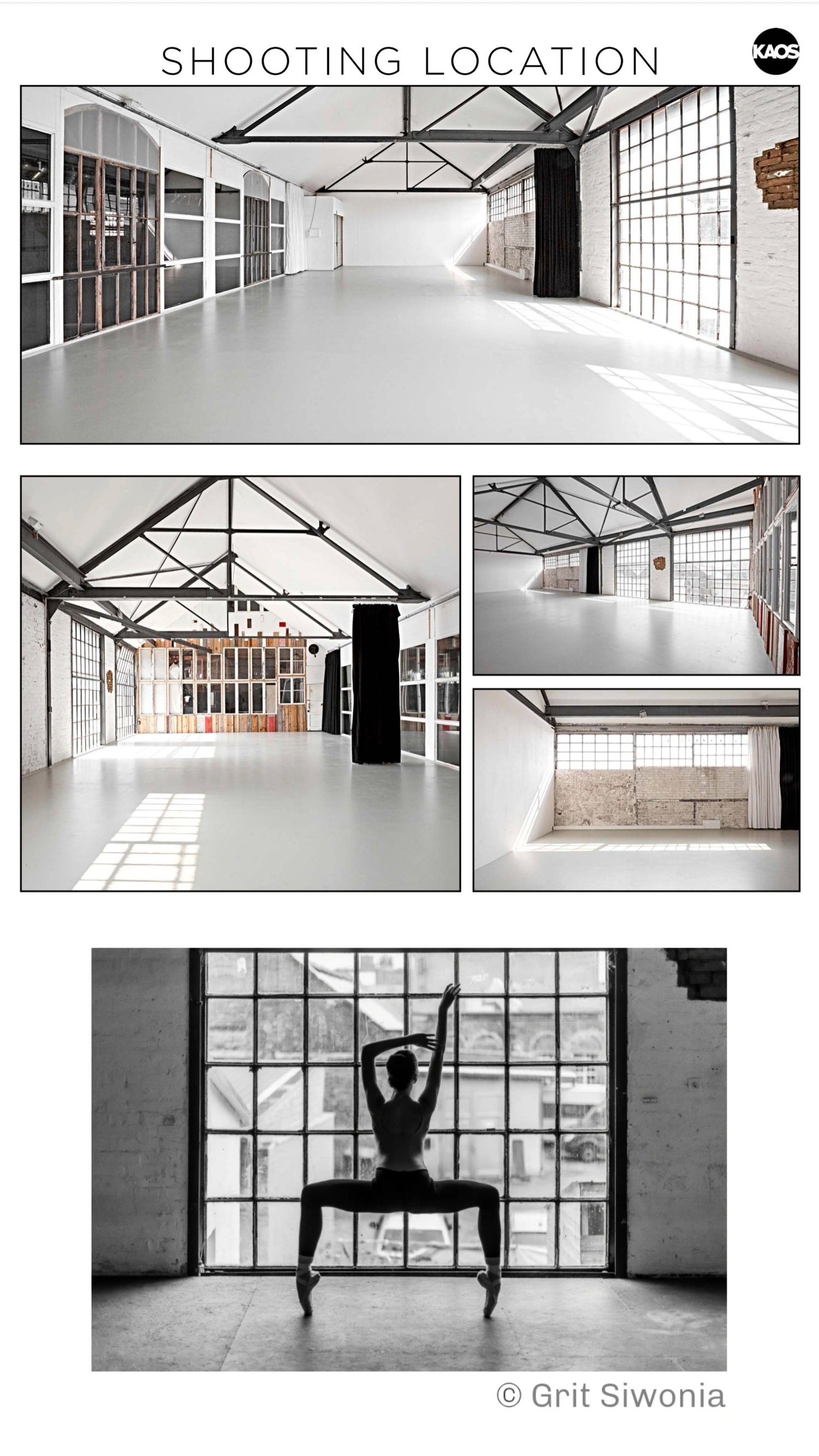 Das 136 m² große Tageslichtstudio überzeugt durch seinen rauen Industriecharakter, geprägt von eindrucksvollem Stahlfachwerk und verschiedenen Hintergrundbeschaffenheiten. Es bietet einen weiten Blick auf die Spree und schafft eine besondere Atmosphäre für unterschiedlichste Produktionen. Zwei großflächige gusseiserne Sprossenfenster mit Ausrichtung nach Südosten, jeweils etwa 3 Meter hoch und bis zu 3,3 Meter breit, lassen reichlich Tageslicht in den Raum strömen und bieten zudem eine tolle Kulisse für unseren Ballett X Fashion -Fotografieworkshop. Für den Workshop stehen uns außerdem noch ein antikes Sofa und ein paar Pflanzen für die Gestaltung zur Verfügung.