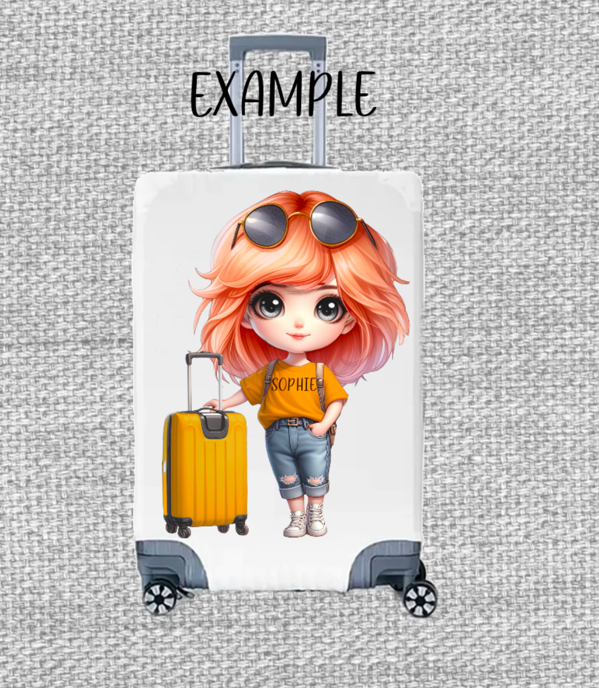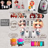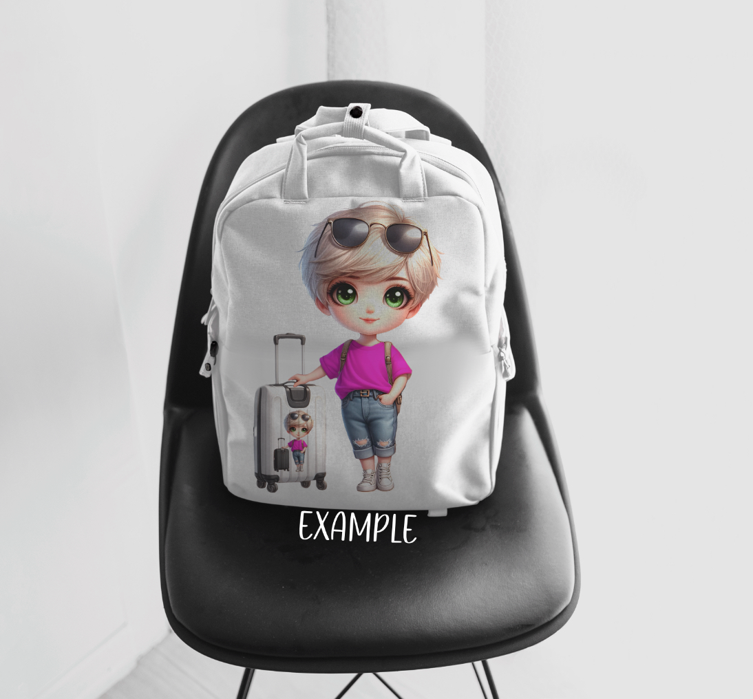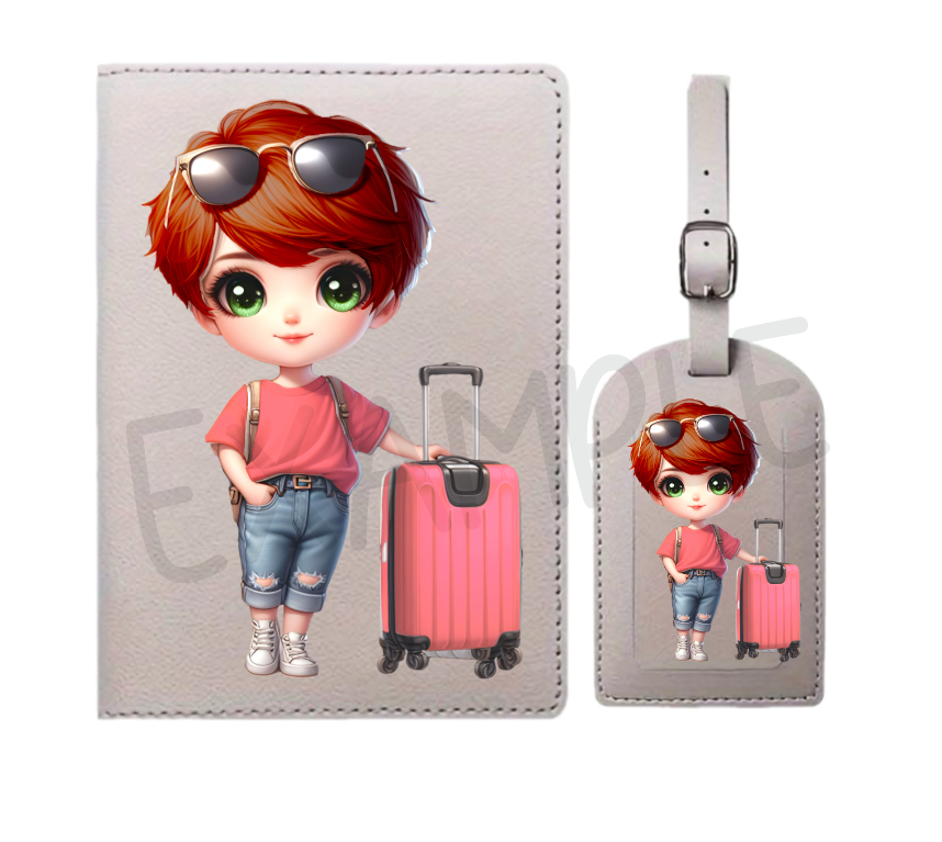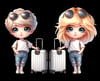 Travel girls Chibi doll. 2 dolls; long and short hair, blonde, brunette, Titian, red, black and grey. Blue, green, brown and grey eyes. 6 coloured t shirts and suitcases to mix and match. Both dolls are blonde and blue eyed as standard, simply add clipar