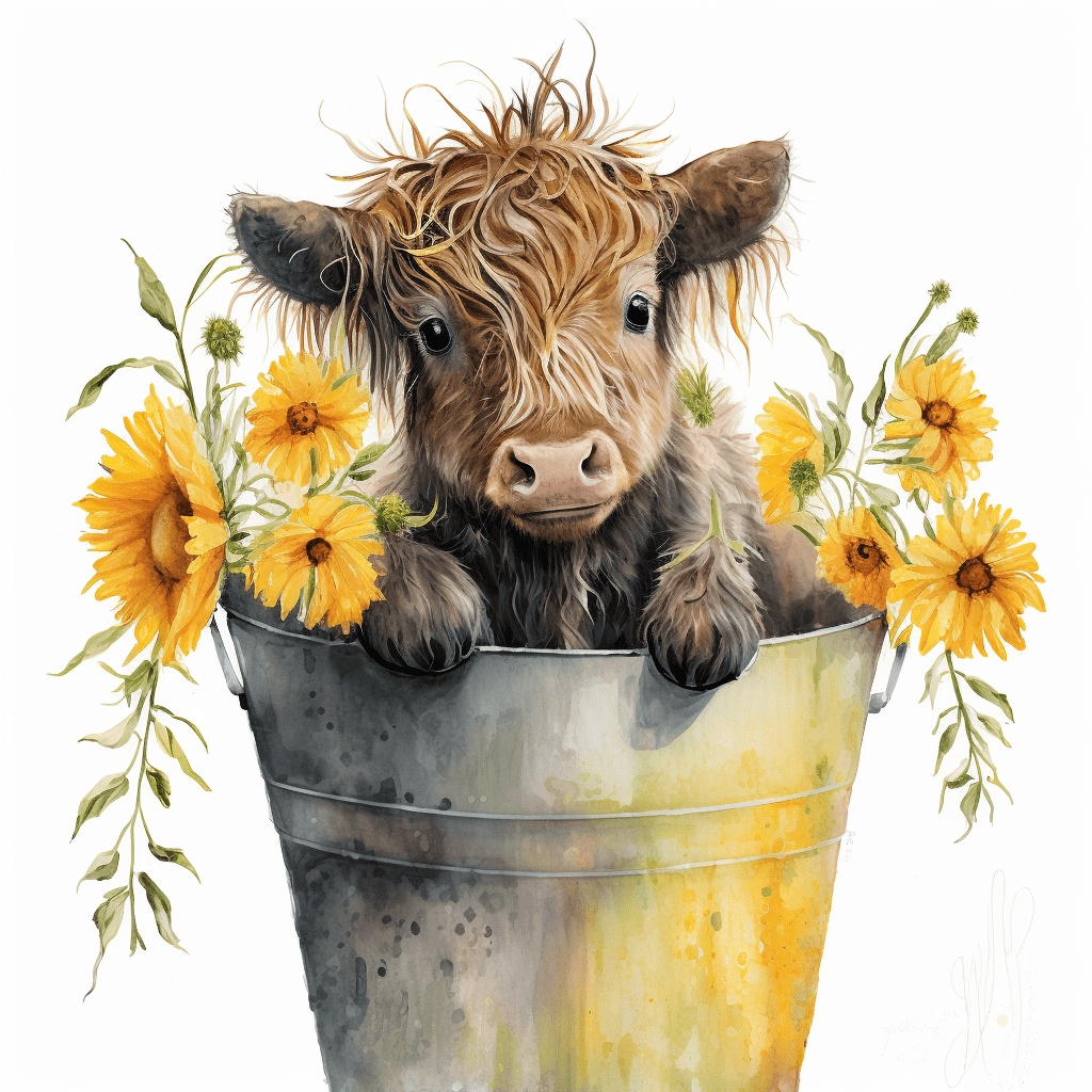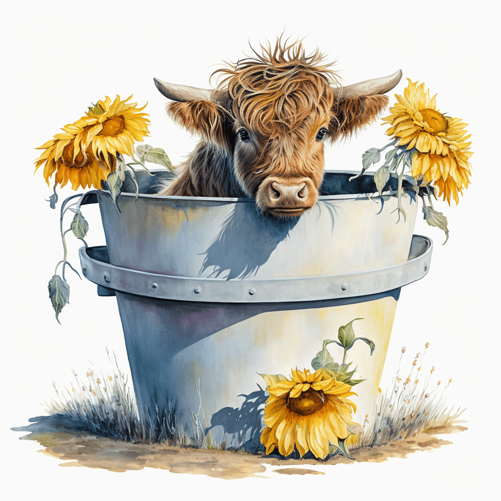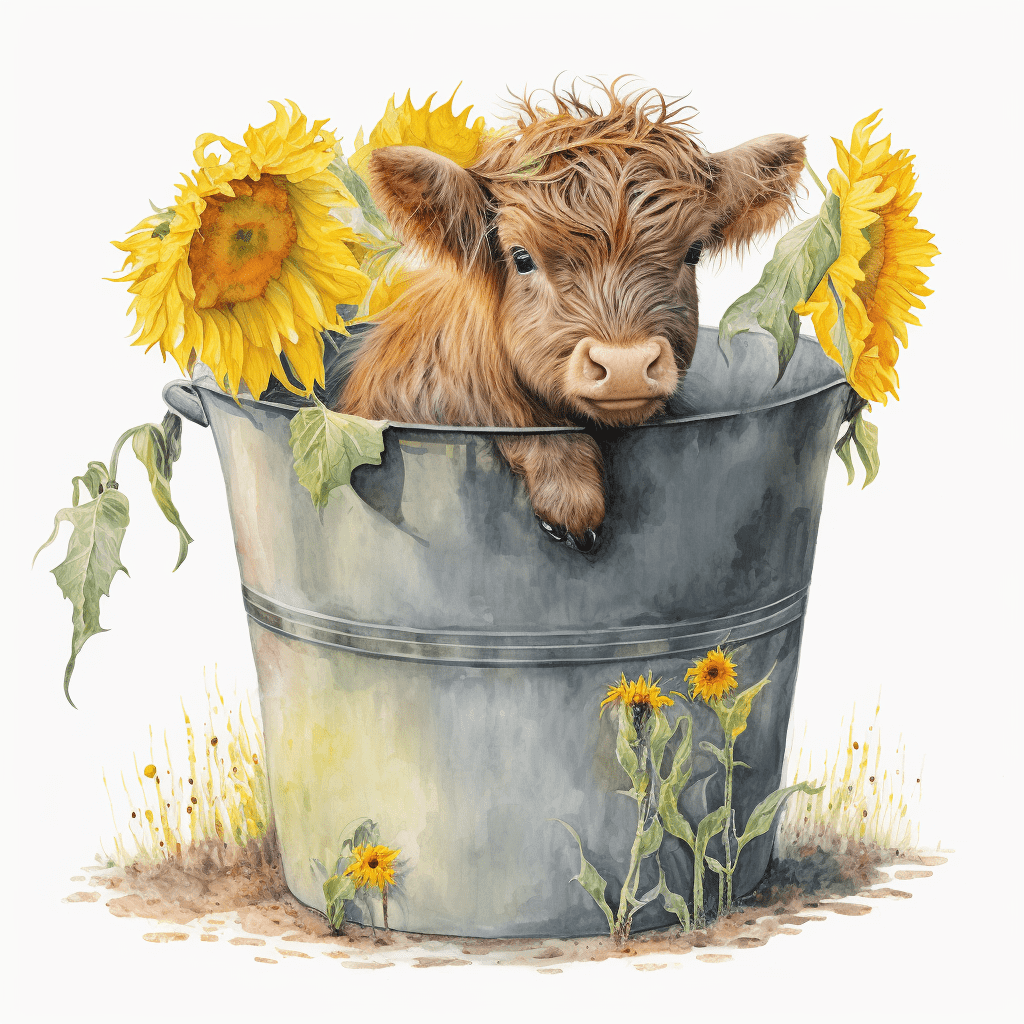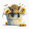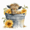 Context: watercolor, highland, baby cow, bucket, sunflowers, cute