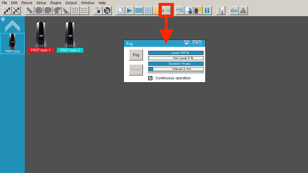 • Si activa el box de “Continuos Operation” el botón de “Fog” quedará presionado, por lo que largará fuego hasta que lo vuelva a presionar (o hasta que corte solo).