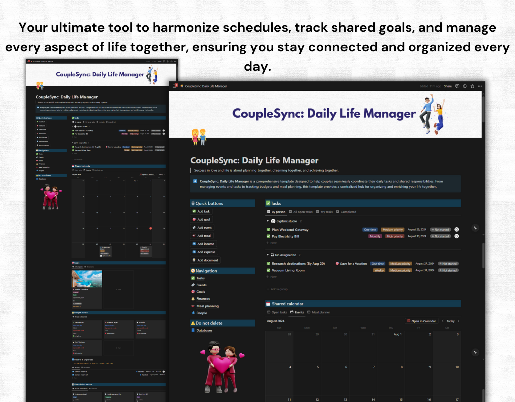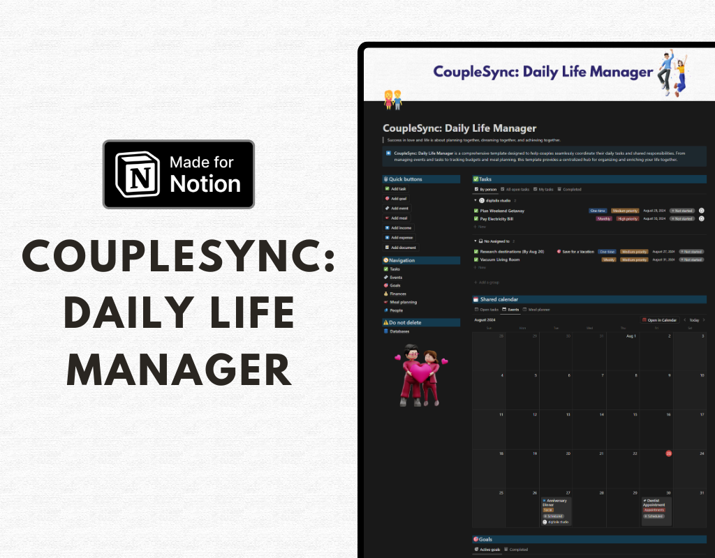 CoupleSync: Daily Life Manager is your go-to solution for managing every aspect of your life as a couple. Stay organized, achieve your goals, and strengthen your relationship with this powerful, easy-to-use template.