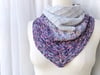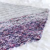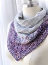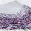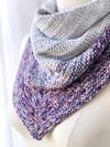 The base triangle is worked flat on the bias in a garter and slipped stitch pattern using color A held double. (The easiest way to do this is to wind the yarn into a center-pull cake and pull from the center and the outside at the same time.) Then stitches are picked up along the straight selvage edge, joined with the existing live stitches, and worked downward in the round in a faded chevron garter stitch border, first with one strand of each color together, then with color B held double.