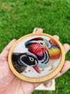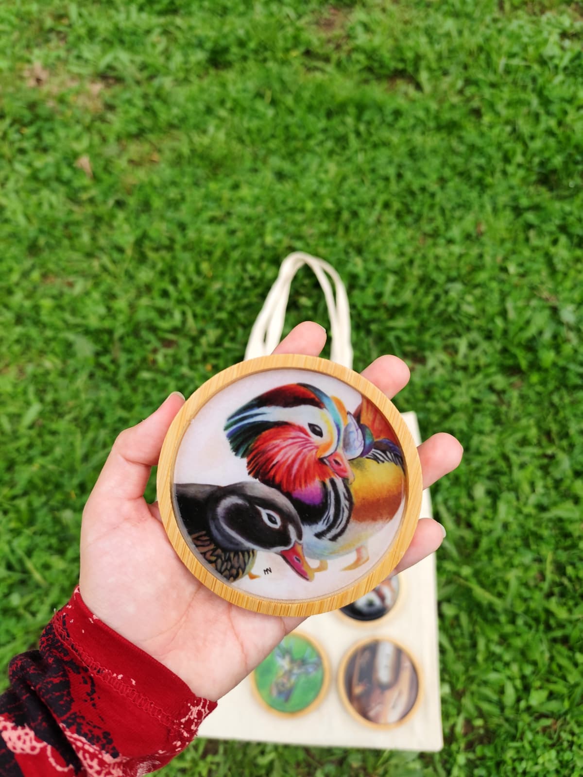 Posavasos basado en una lámina realizada con lápices de color que representa a dos patos mandarines, un macho y una hembra. ¿Adivinas cuál es la hembra? Te sorprenderá descubrir que el más colorido no es ella, sino el macho, que despliega sus colores para atraer a su compañera.