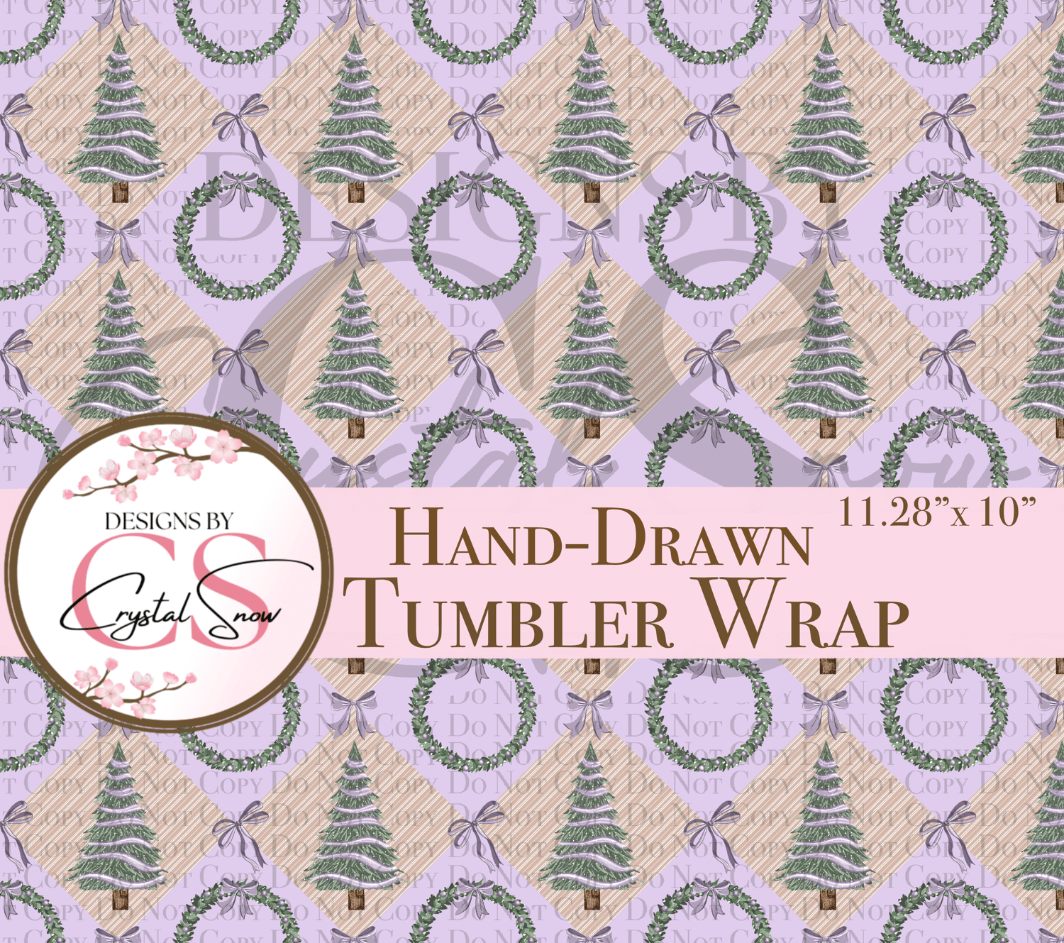 Lilac Evergreen Tumbler Wrap | Hand-Drawn Winter Tree & Wreath Design | Pastel Christmas PNG for 20oz/30oz Tumblers | 11.28x10” Digital Download