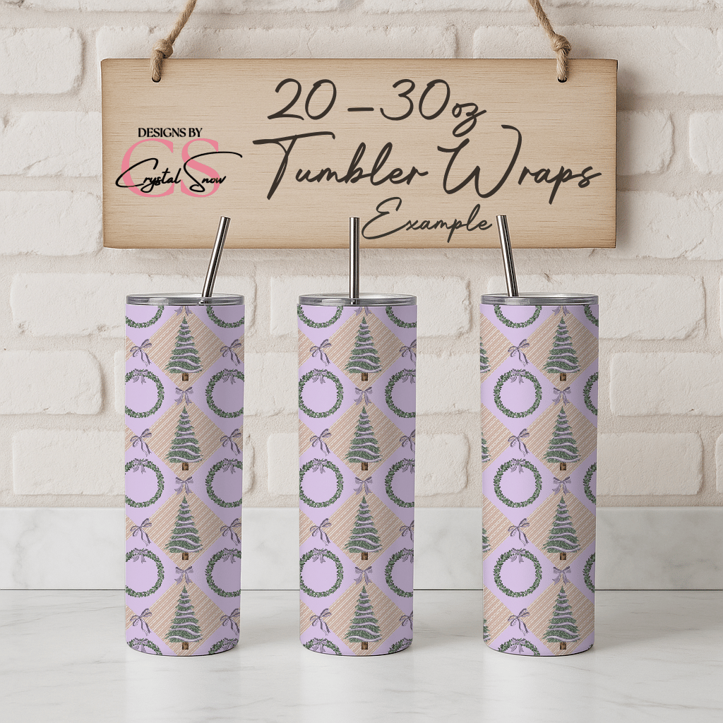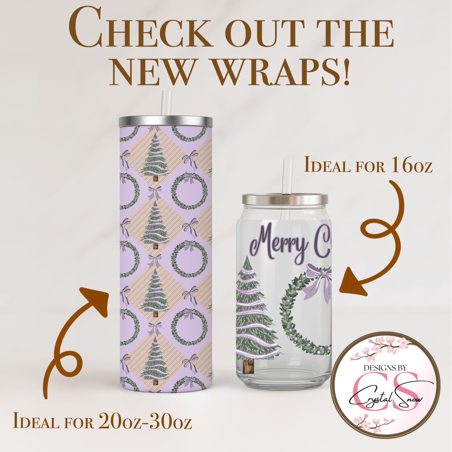 This hand-drawn tumbler wrap features elegant evergreens and festive wreaths tied with lilac ribbons — perfect for Christmas crafting, sublimation projects, or cozy winter gifts.