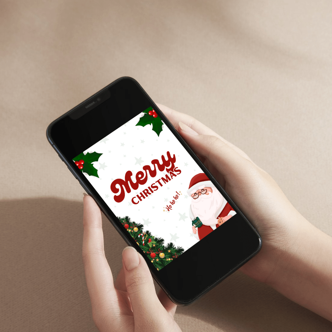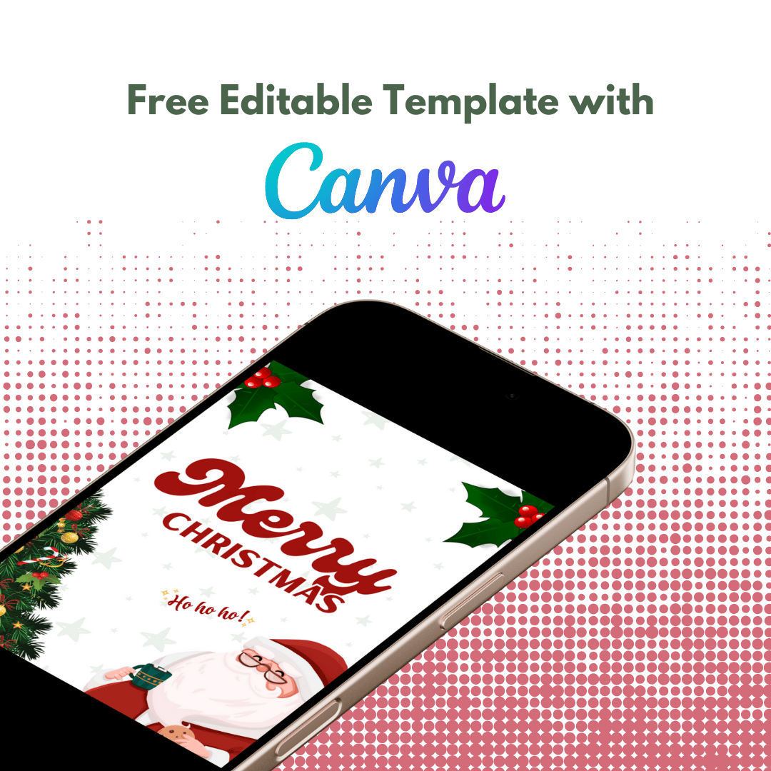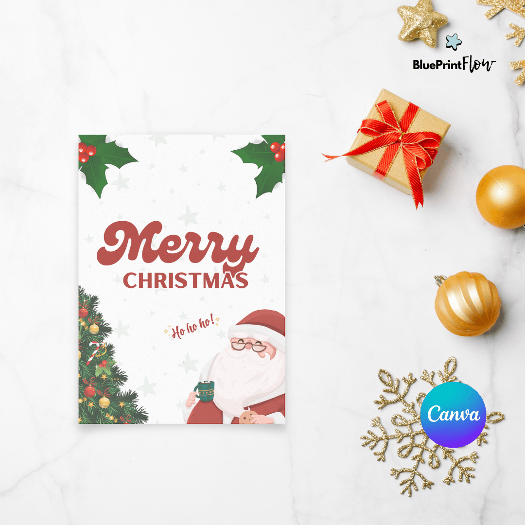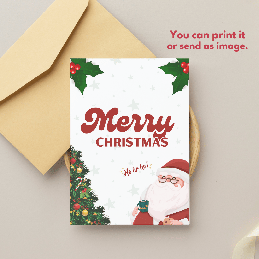Featuring a cheerful cartoon Santa, a beautifully decorated Christmas tree, and festive holly details, this design is perfect for sending holiday greetings to loved ones. Whether you're preparing digital invites or printable cards, this template offers a seamless blend of creativity and convenience.