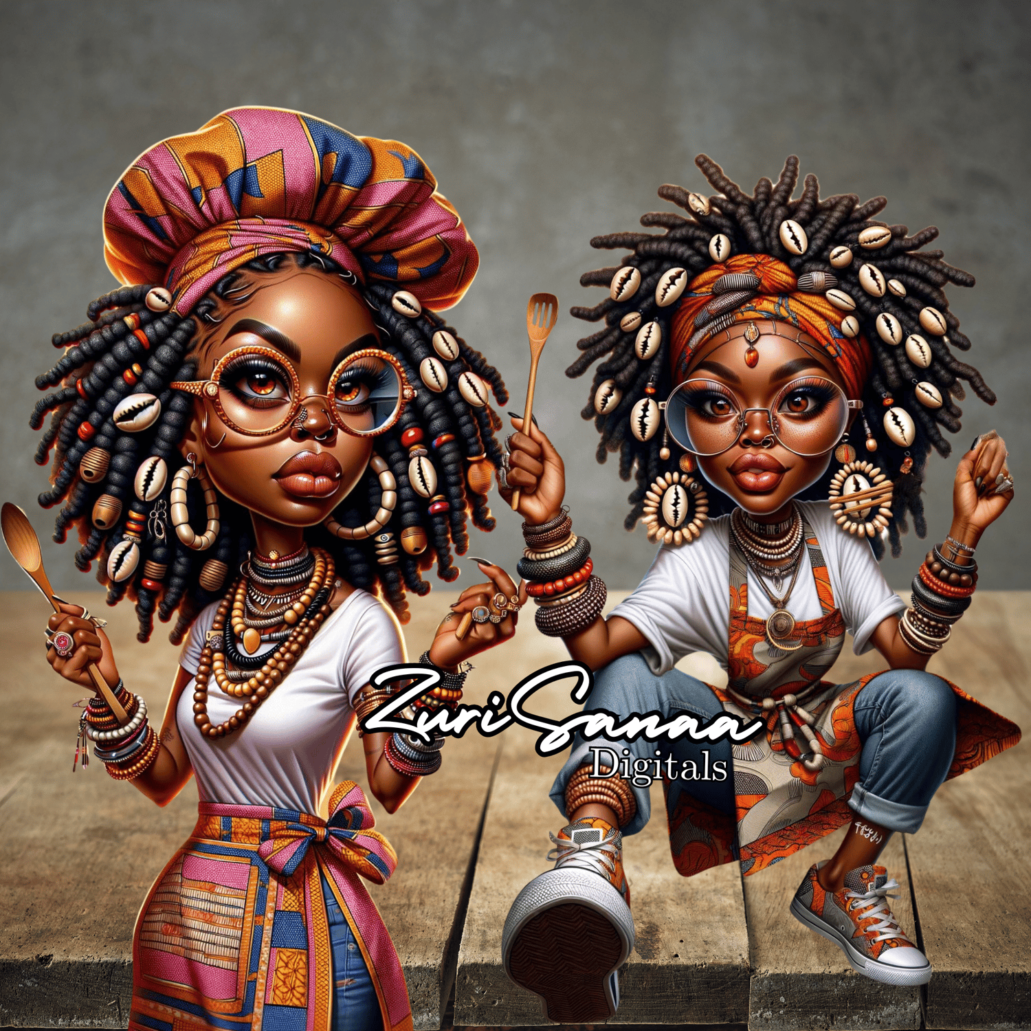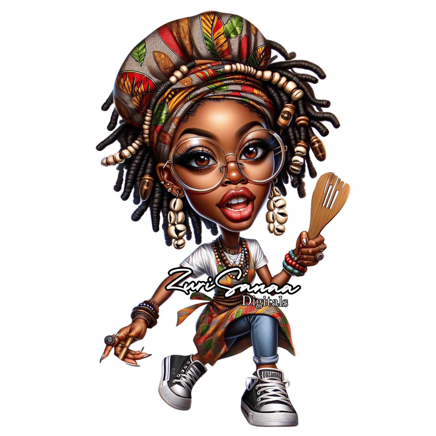 - Fashion-Forward Caricatures: The character is styled in oversized round glasses, Afrocentric jewelry, and an Ankara print apron and chef hat, teeming with lively patterns.
