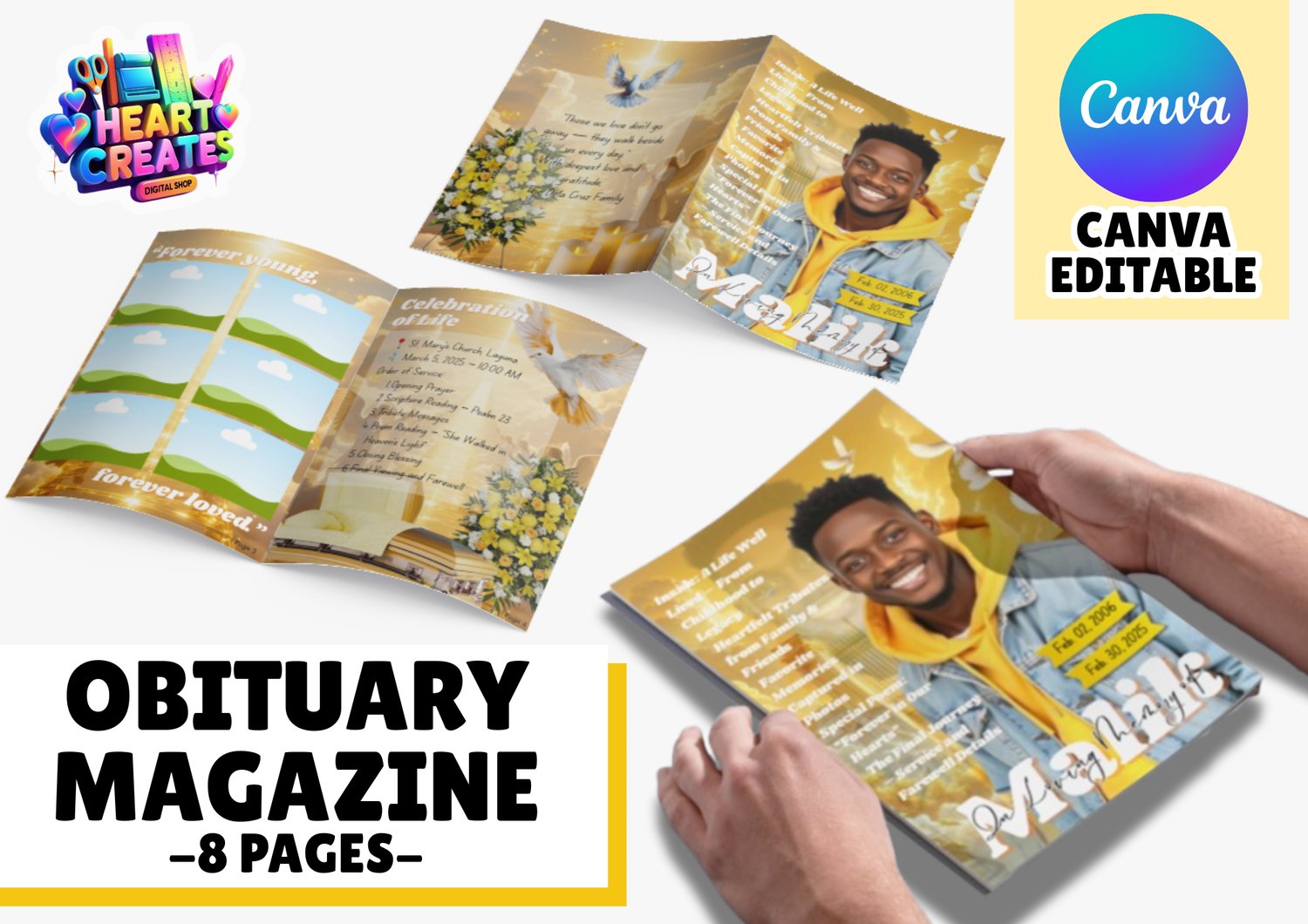 ๐ผ Yellow Memorial Obituary Magazine Template | Digital Download